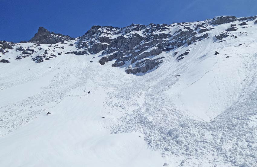 moquette à tous les étages sauf sur les 200 m du col (ouest). pas vu ici de neige fraîche ou si peu. Purges en versant froid (NO), notamment K10.1