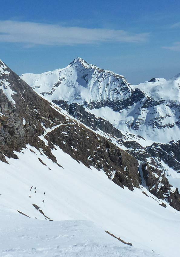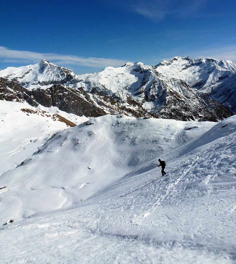 Voie normale de montée par le vallon de la Reale atteint en montant au-dessus d'un télésiège hors service. Descente dans le grand vallon des rio de Becco et de Fontane. Fourvoyage dans les couloirs du bas sous 2000, remontée, puis descente en partie à pied avant de reprendre les skis à 1850 m. Déconseillé (D'ailleurs il n'y avait pas de traces dans ce vallon, si ce n'est celle des chamois).