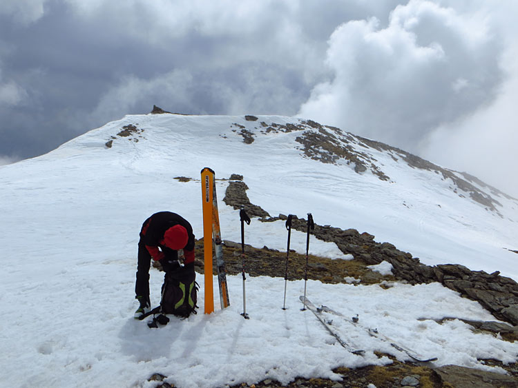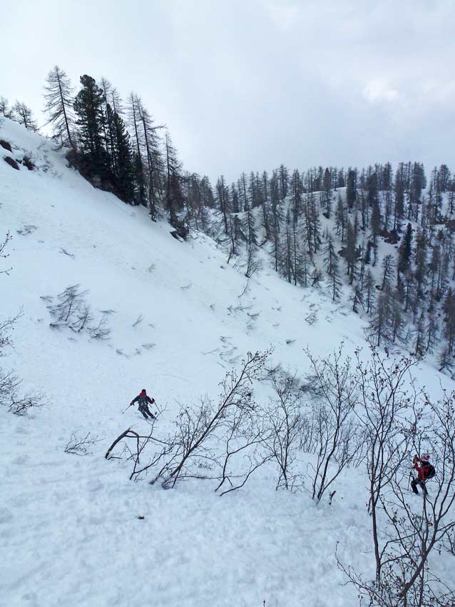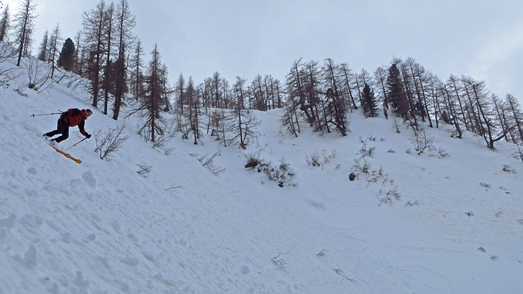 avec une nuit sans regel et la couverture nuageuse on s'attendait au pire, on a (presque) eu du meilleur avec cette neige intermédiaire, pas encore alourdie, dans la combe de descente directe.