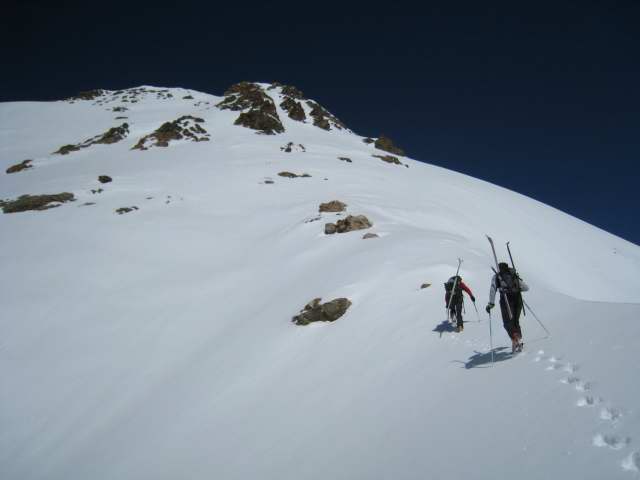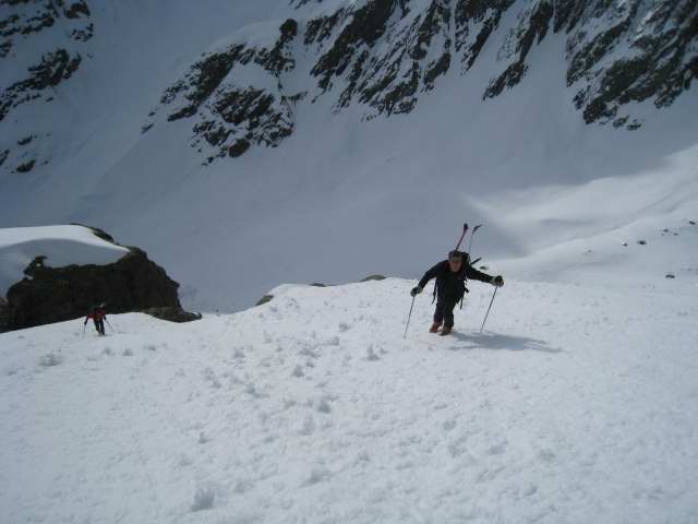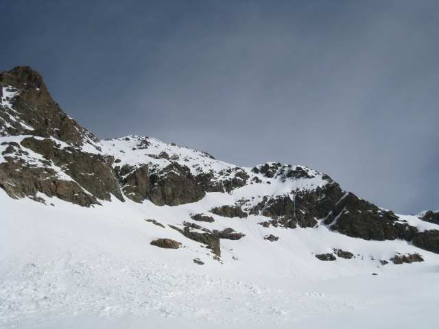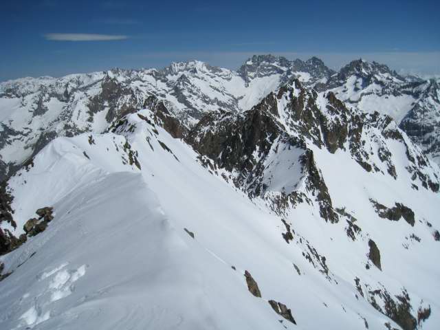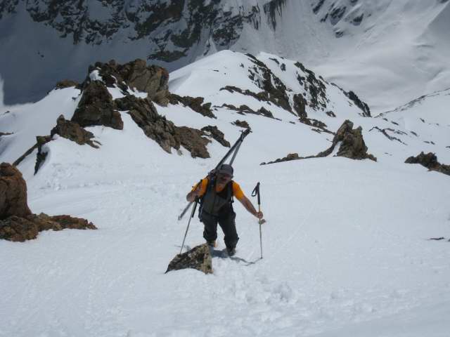 Plan du Carrelet=>Aprés confluent Petit Chardon -Chardon prendre à D vers 2200 echarpe gauche droite puis droite gauche(remontée en crampons)Franchir un court couloir expo,prendre pied dans un entonnoir que l'on remonte tranquillement.On sort sur un grand plateau vers 2900.Traversée à droite se diriger vers un cirque trés chaud,le remonter et traverser vers la droite jusqu'à un couloir marqué.Le remonter et rejoindre l'arête que l'on suit jusqu'au sommet bien évident.