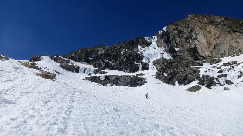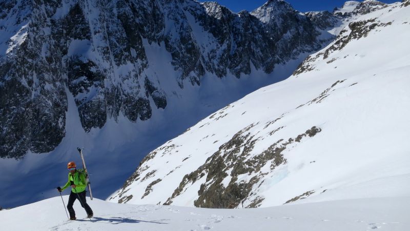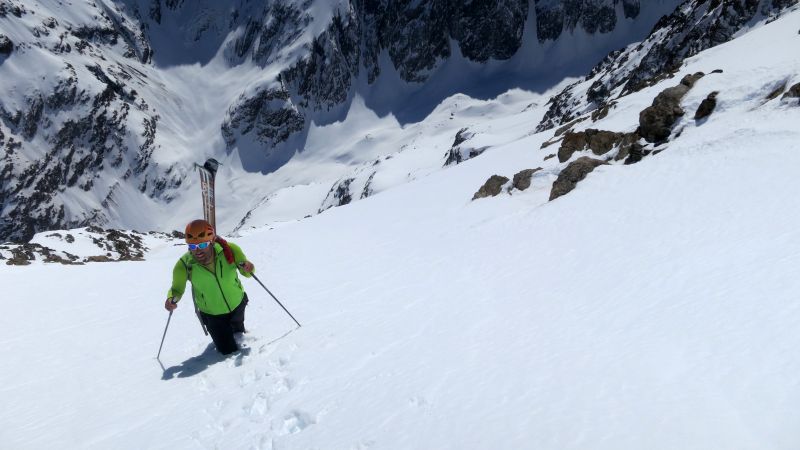 Toujours pas vraiment transfo > 2500m malgré l'orientation et la pente, sauf quelques sections. Petite frayeur pour Cyril qui déclenche une mini plaque formée par la neige de la veille, vers 3400m, heureusement trop peu épaisse pour le déstabiliser