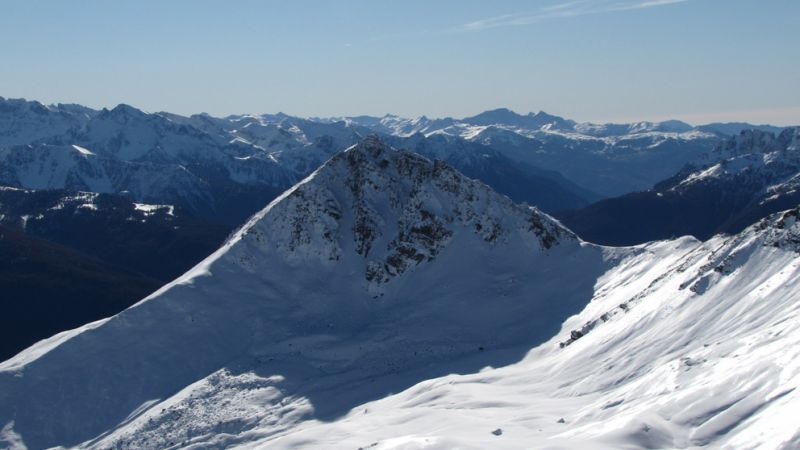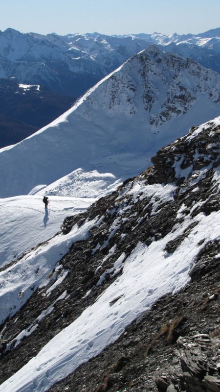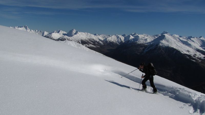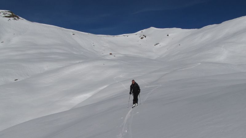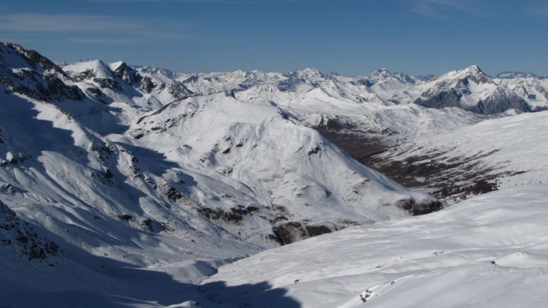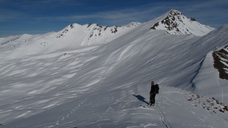 Enneigement plus faible qu'autour d'Abriès. Portage jusqu'à 2200. Ensuite epaisseur augmente vite mais la transformation est inachevée sauf plein sud raide. Crêtes soufflées. Versant Fonts de Cervières bien garni de neige froide stable.