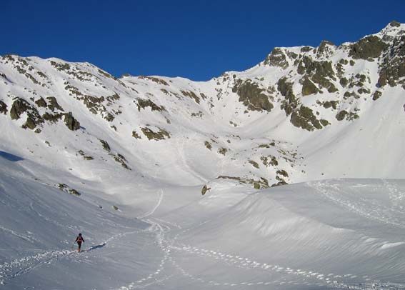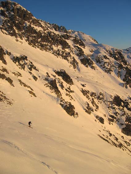 très peu de neige dans le venetier même sur le haut ; ça passe bien sans toucher parceque la neige est dure. Quant à l'approche choisie (comme les autres redacteurs, voir fiches) apres le compte-rendu de lta de la veille, je me demande si elle n'est pas moins rapide que le départ classique même avec 200 m de portage sur celui-ci.