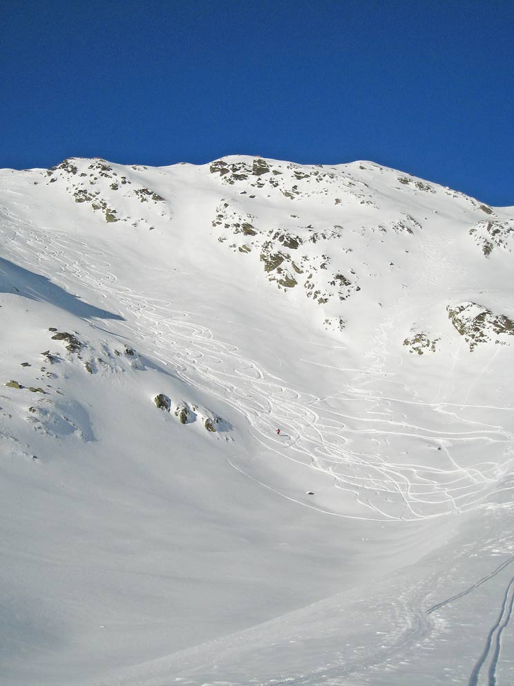 Beaucoup de transport observé avec le fort vent de nord-est. La trace de la veille était effacée au delà de 2000 m. Prudence dans la pente finale (que nous avons remontée rive gauche) dont la répartition de la neige semble inégale). Pas mal de monde dans le secteur vers 10h30 en train de monter vers 10h30.