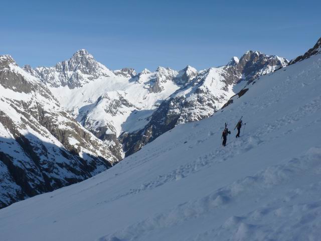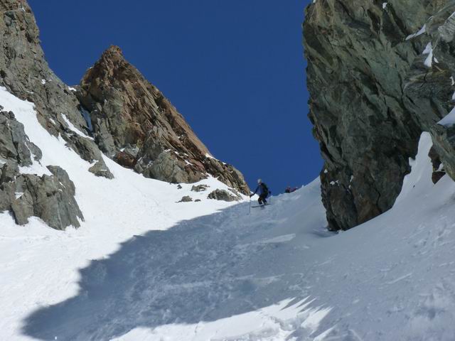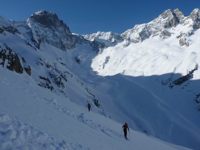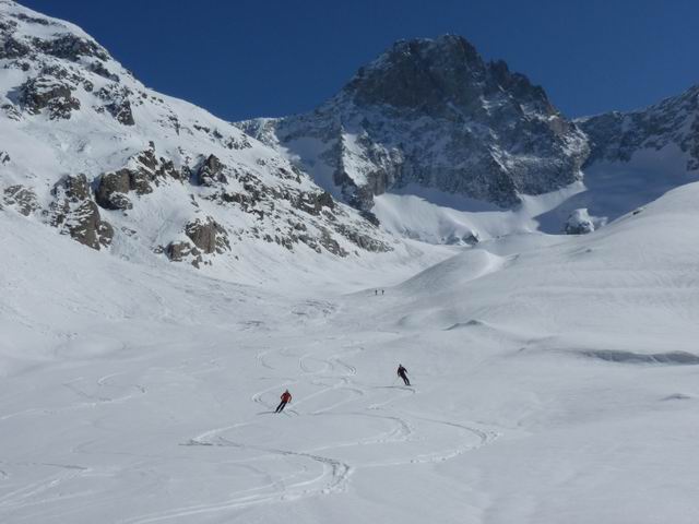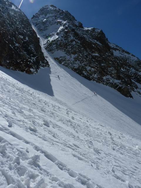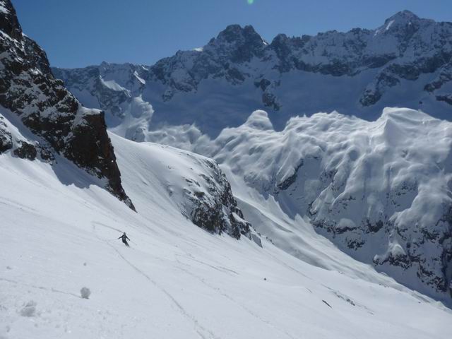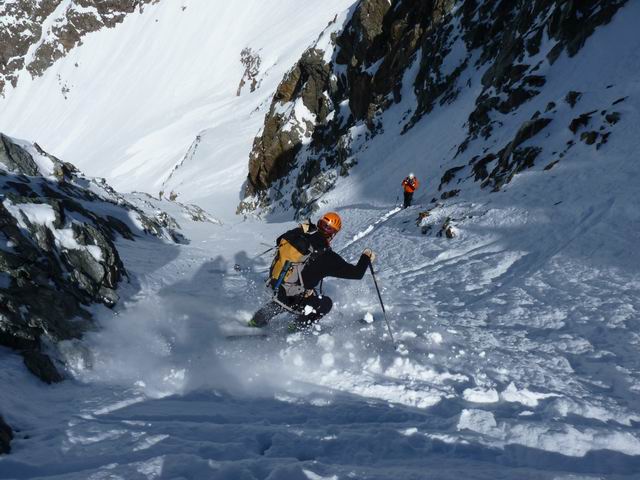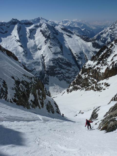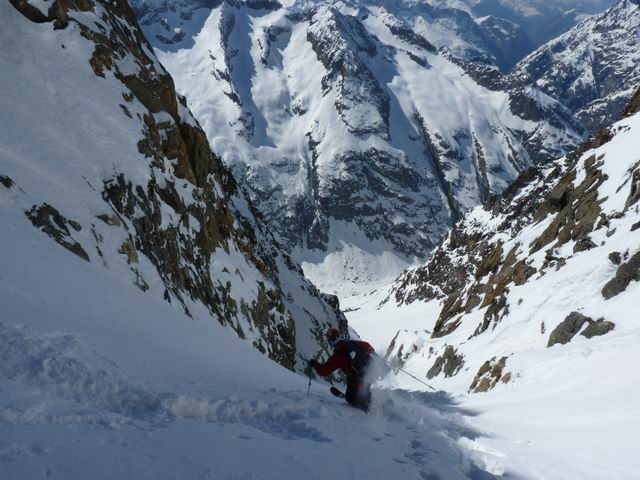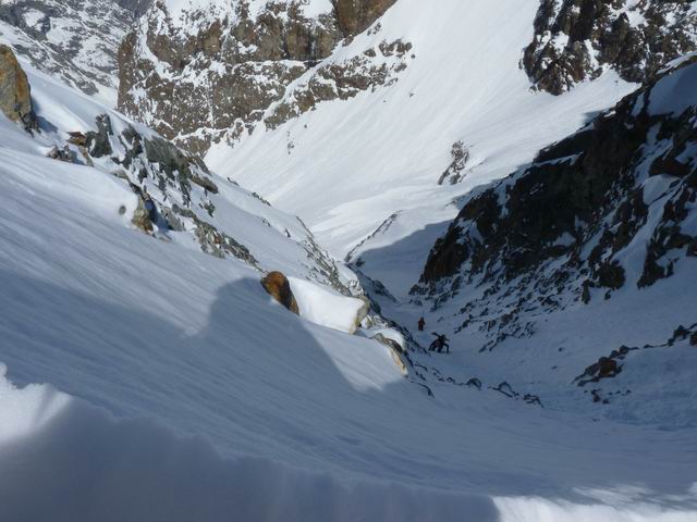 Un peu de pente, de la poudre, de la transfo avec un vallon bien glissant même à 16h = une bonne journée, ternie qund même par le non-arrêt à la Cordée ! Quelques mines dans la très raide sortie du couloir N, recouvertes de neige foireuses, d'où un réta accrobatique surtout pour les derniers...Plutôt que de rejoindre le glacier de Petit Pierre, on a préféré redescendre directement pour aller enquiller le NW, car la sortie sur l'arête sommitale de la cime de l'Encoula ne parmettait pas du ski intégral.