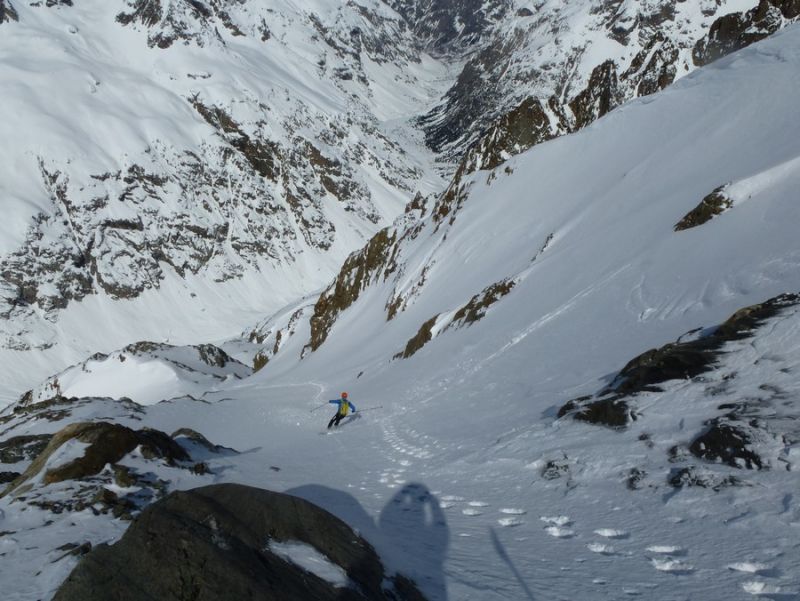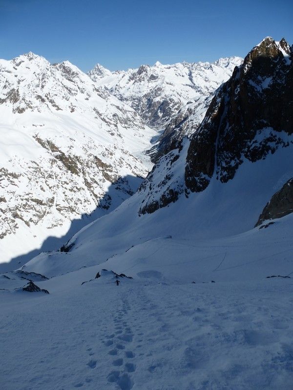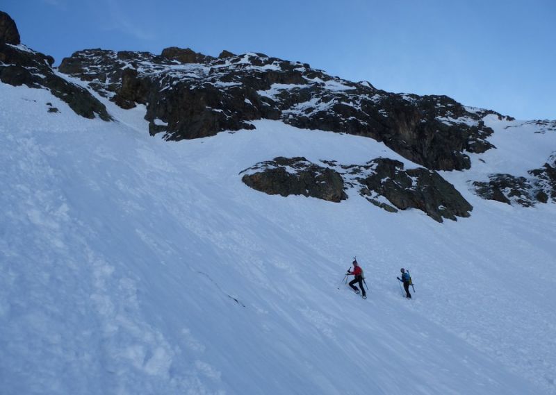En partie haute, petites plaques de surfaces en quelques zones. Dans le raide, ça sluffe mais rien de méchant. Dans le couloir d'accès sud-ouest, pas transfo en profondeur, il fallait descendre avant que la croute de surface ne soit trop revenue. Dans le vallon c'est pourri, mais la trace reste dure à 13h avec une glisse pas si mauvaise