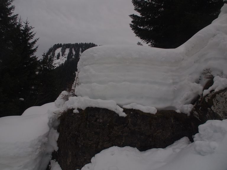 Bonne poudre dense (40cm) dans la face mais avec formation d'une croute de glace rive gauche car l'eau coule au pied des falaises et gèle sur la surface de la neige.
