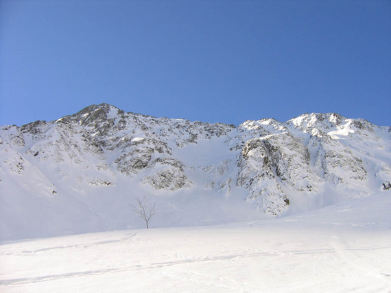 Ca a pas mal soufflé au pied de la face N., on trouve un manteau très changeant avec des petites accumulations de la poudre de la veille et la couche ancienne croûtée, plaquée, portant de temps en temps.