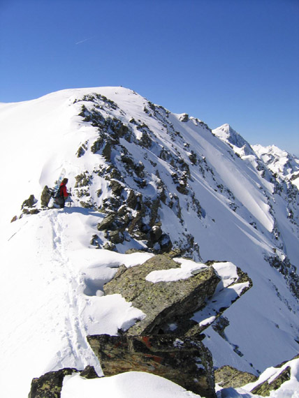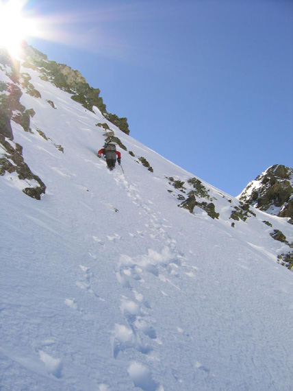 Les premiers 20 m du couloir partant du sommet sont minés de rochers.