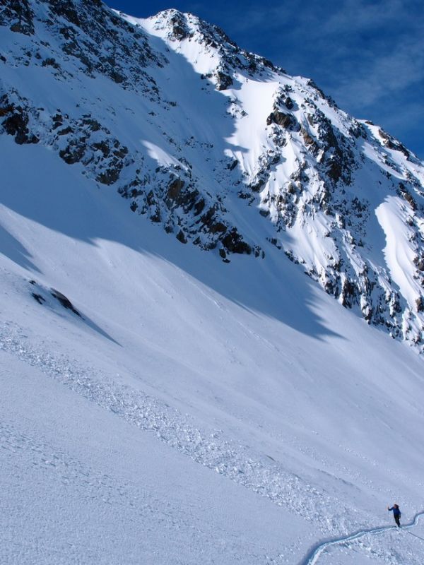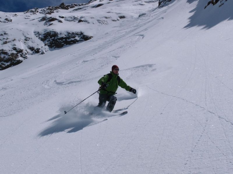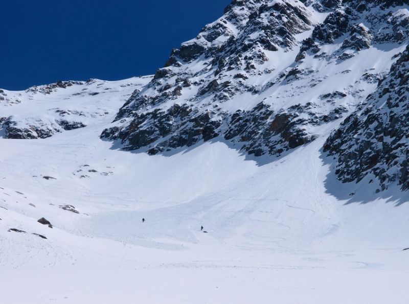 Excellent regel, croute portante sous 2600 avec fine pellicule de neige fraîche dessus. A partir de 2600 la couche de fraîche dense augmente nettement. Les conditions nous ont paru plutôt saines dans les pentes remontées (bonne cohésion, pas de couche ferme perceptible favorisant la rupture). Il n'en est pas de même dans les couloirs nord soumis aux vents de nord puis de sud de ces derniers temps. Ceux-ci ne sont pas très bien remplis ne favorisant pas l'accroche de la neige récente. Rentrée "précautionneuse" dans le couloir nord occidental qui s'est purgé dés qu'on y a mis les spatules (plaque peu dense) --> belle coulée jusque sur le glacier.