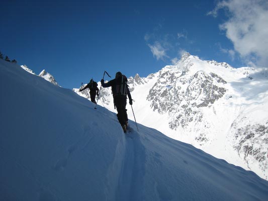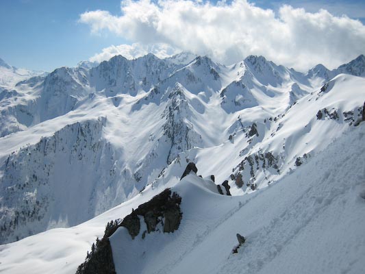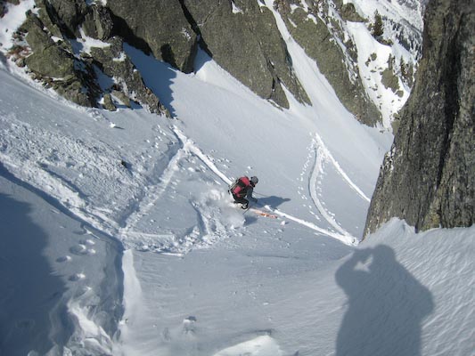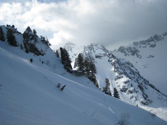 Comme le dit Volo c'est l'endroit le plus enneigé...du monde. Aujourd'hui nous avons skié à la voiture à 1100m. Très beau couloir que l'on découvre au fur et à mesure, la cotation nous a semblé un peu forte un petit 4 peut être. A coté du rectiligne de Barme ( 4.3). Ou l'autre couloir en S des Cabottes toujours 4.3. Il n'y a pas photo.