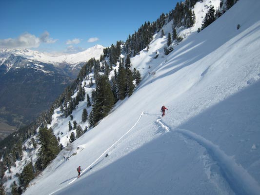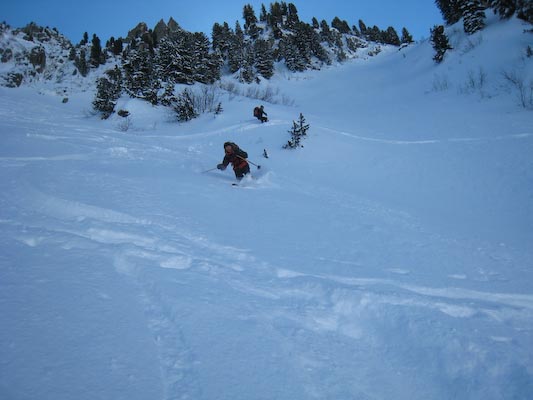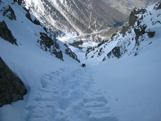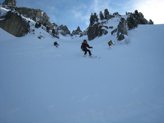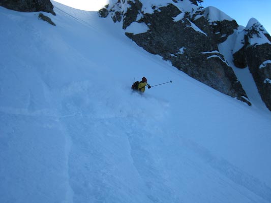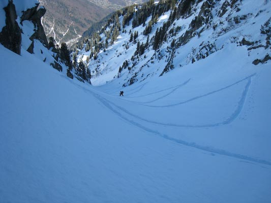 C'était le bon plan, un couloir suffisamment encaissé à l'abri du vent, neige parfois un peu dense dans le couloir en S, poudre de cinéma dans le deuxième couloir.