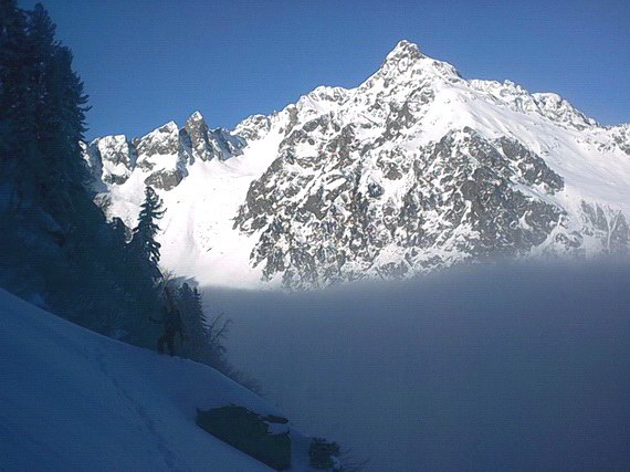 acceder au mieux au couloir. Pieges par le brouillard qui nous en masquait l'entree, nous sommes montes jusqu'a 1400. La traversee pour en rejoindre la base s'est