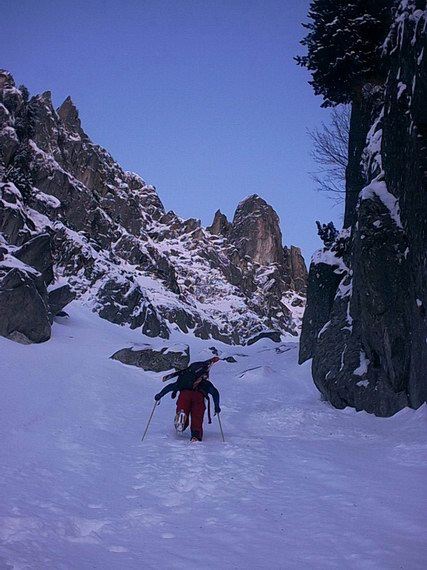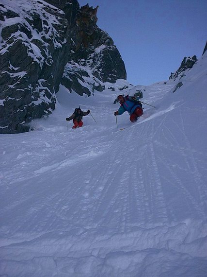 ski dans ce couloir des Peres qui jouit d'une belle ambiance. La derniere partie est splendide avec sa sortie dominee par une tour de granit a la silhouete presque