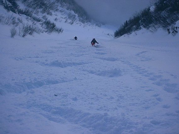 Patagoniene. La neige, jamais ventee, etait tres seche dans les 700m du couloir. Il manque juste un metre pour masquer definitivement tous les rochers affleurants et pour