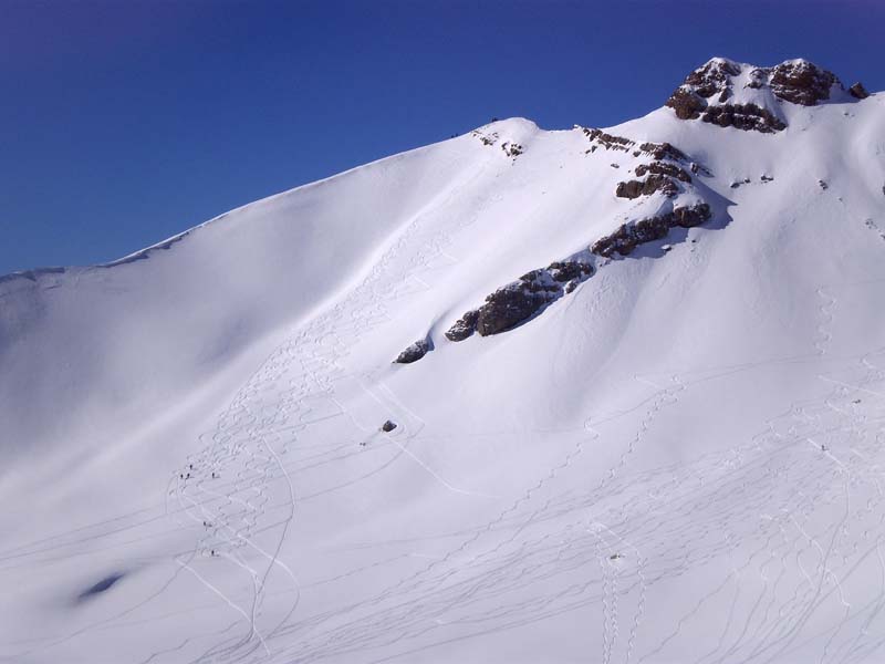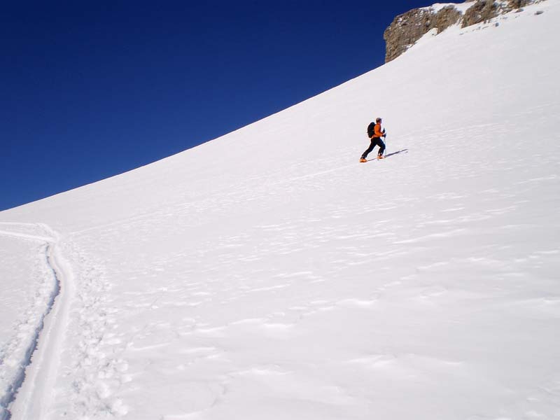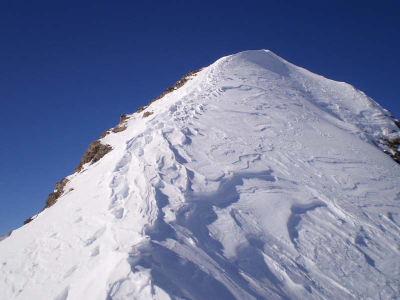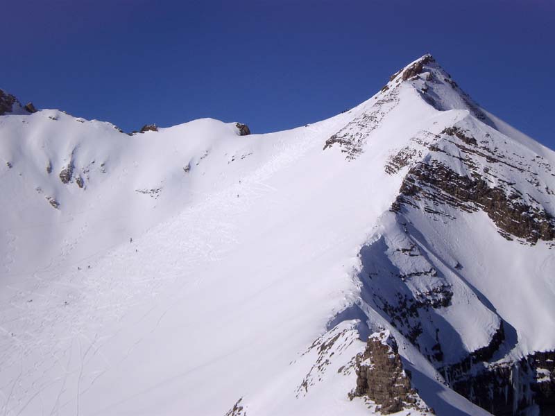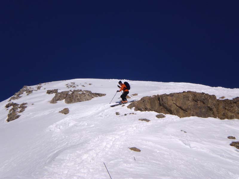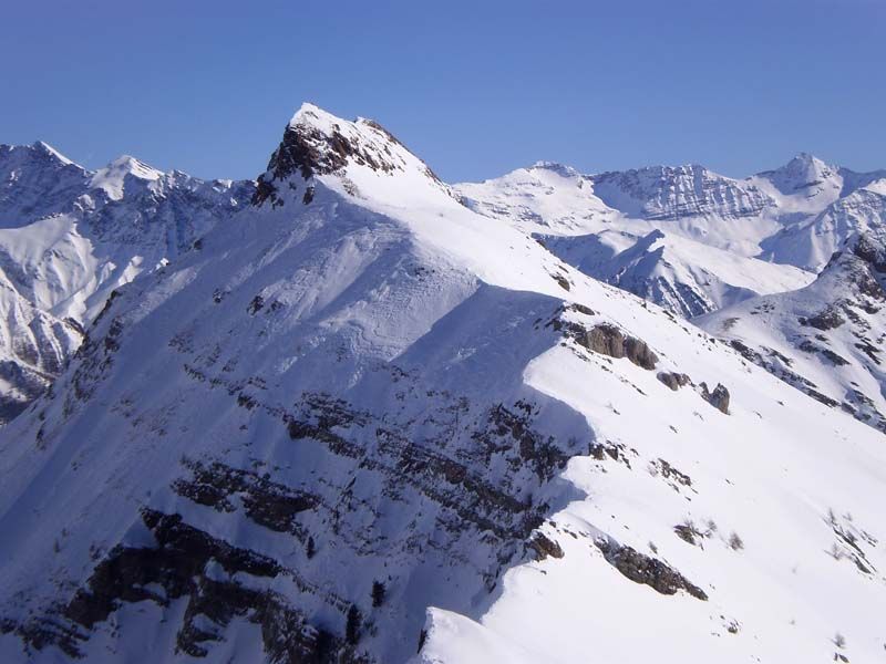 Sortie confidentielle avec pas plus de trente voitures aux Richards et une centaine de skieurs et raquettistes disséminés sur les belles pentes du coin... J'ai rencontré une copine au col de la Vénasque, et j'ai donc laissé Paul s'adjuger seul le sommet, descendu à skis sans problème. Pour monter à Clot Lamiande, nous avons préféré mettre les crampons, parce que la neige était instable sur un fond dur. Joli petit parcours d'arête assez aérien sur la fin. La neige n'était pas mauvaise à skier, mais un peu physique, car il s'agissait souvent de grains fins liés qui ne facilitaient pas le déclenchement des virages.