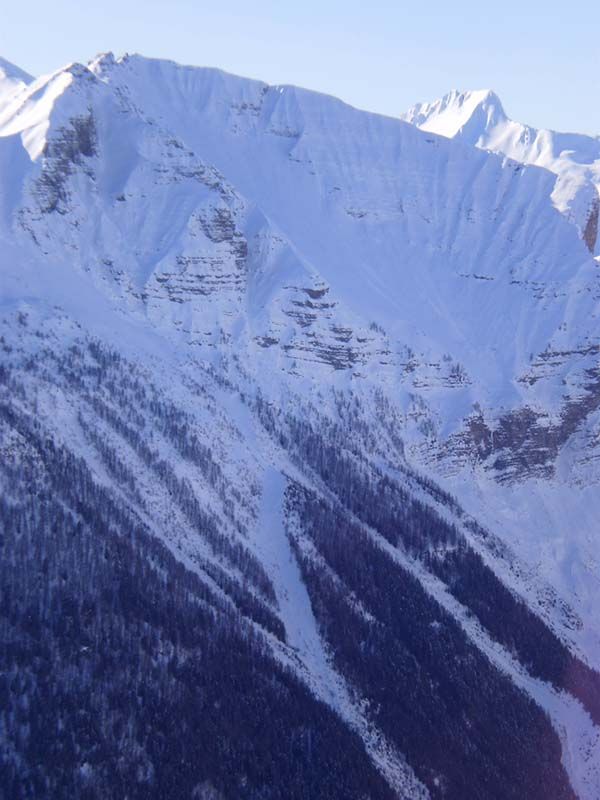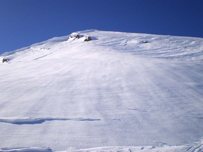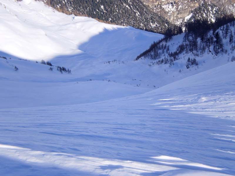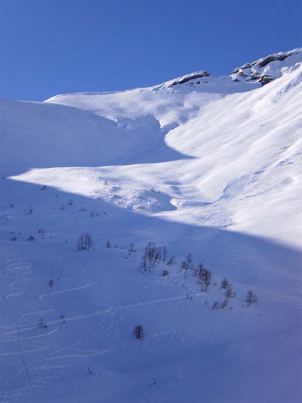 Les vents de nord et d'est ont beaucoup soufflé par ici, neige souvent cartonnée, voire gelée près du sommet. Je n'ai pas été tenté de descendre la combe NE en raison de la mauvaise qualité de la neige, irrégulière. J'ai tenté ma chance vers l'est dans les pentes soutenues qui rejoignent directement la piste de montée. Le haut direct m'a paru douteux et un peu trop raide pour la stabilité, j'ai fait une coupe avant de rebrousser chemin et de rejoindre la pente un peu plus bas par un détour : 20 cm de poudreuse sur 10 cm de grains fins liés sur une fine couche de regel très curieuse (mince couche de glace enserrée entre deux couches de regel). Plus bas, on rencontre de la poudreuse posée sur une sous-couche très dure. Bref, des conditions bien moins bonnes que plus à l'ouest où les chutes ont été plus abondantes et moins ventées. Il faudrait du redoux