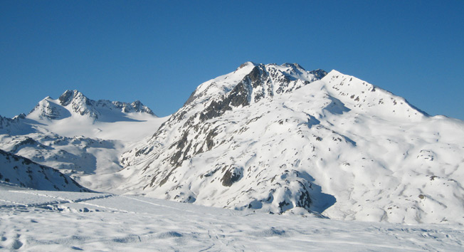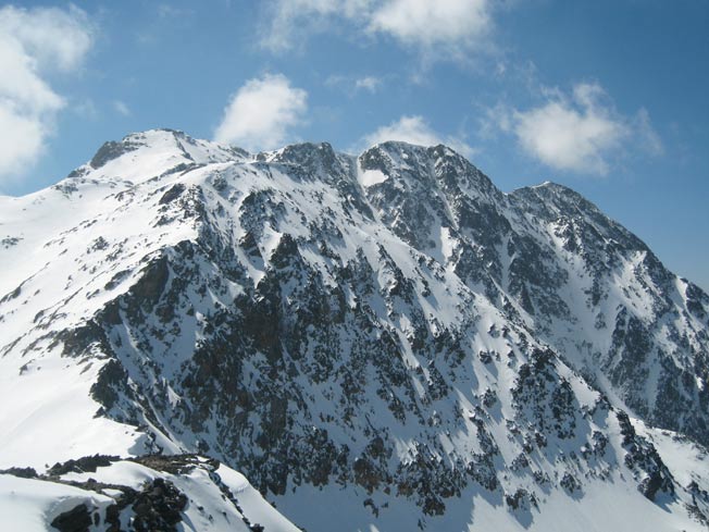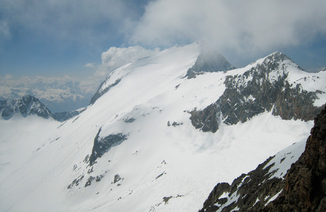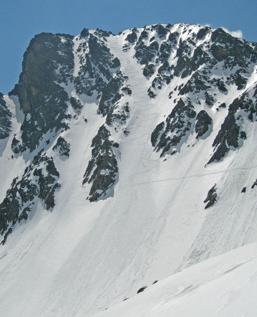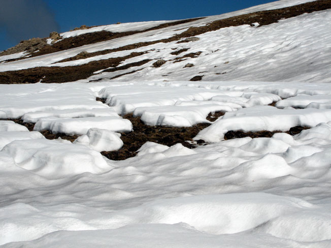névé presque partout sauf nord > 2700. qqs cm de poudre sur dure en pente raide nord. énormes ravines partout.