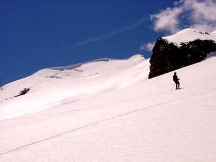 La voie de l'Etendart, sauf que sur le glacier on tire à droite vers la brêche de la Cochette (dépôt ski) puis par l'arête à la cime au départ du couloir et de la pente nord-ouest D+/D- : 1400. 2.2/R/E1