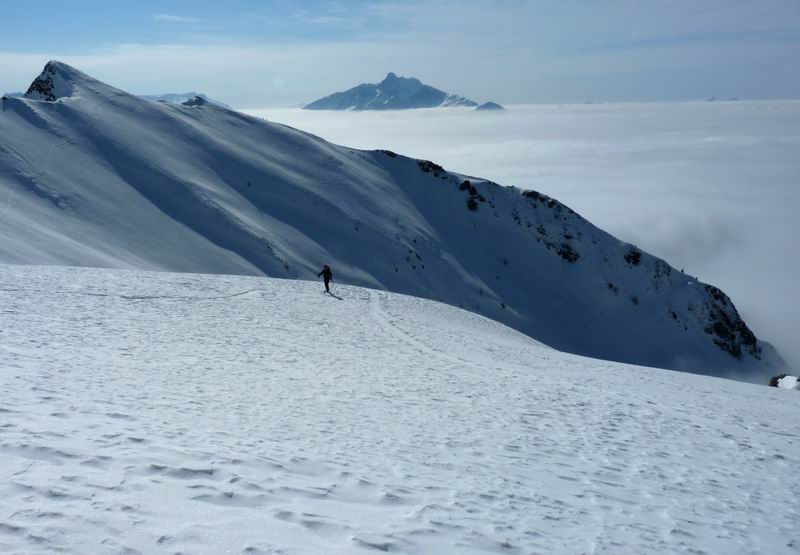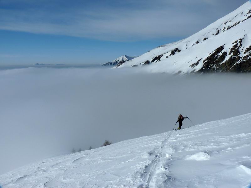 Bonne pioche ! Venu ici chercher le soleil à défaut de bonne neige, on a eu droit aux 2 : neige parfaitement conservée sous 2000m, ici le vent n'a travaillée qu'au dessus de cette altitude. Brouillard exact au RV mais avec une visibilité très correcte, et au dessus, c'est grand beau. Mais si on la chaleaur, les pauses restent courtes on se refroidit bien