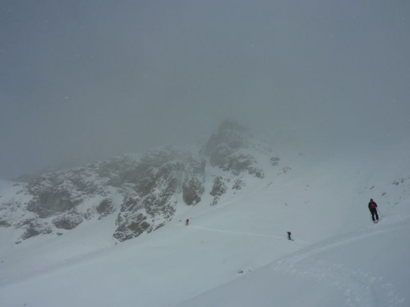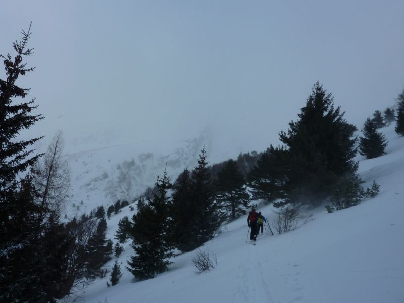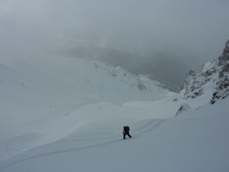 Motivation pas facile à remonter à la sortie de la voiture. Manu qui a eu l'idée de venir ici y croit, traçant devant. On continue malgré le vent. Petit à petit, le brouillard et le vent s'estompent, le ciel se dégage. Au col on subit les éclaircies avec le sourire. Très bonne descente dans une poudre légère. Finalement un premier cadeau de Noël inattendu!