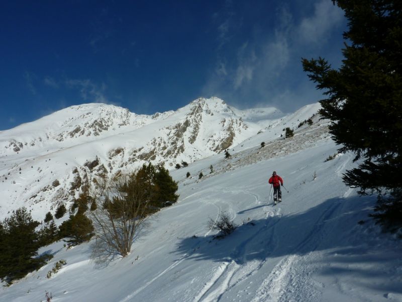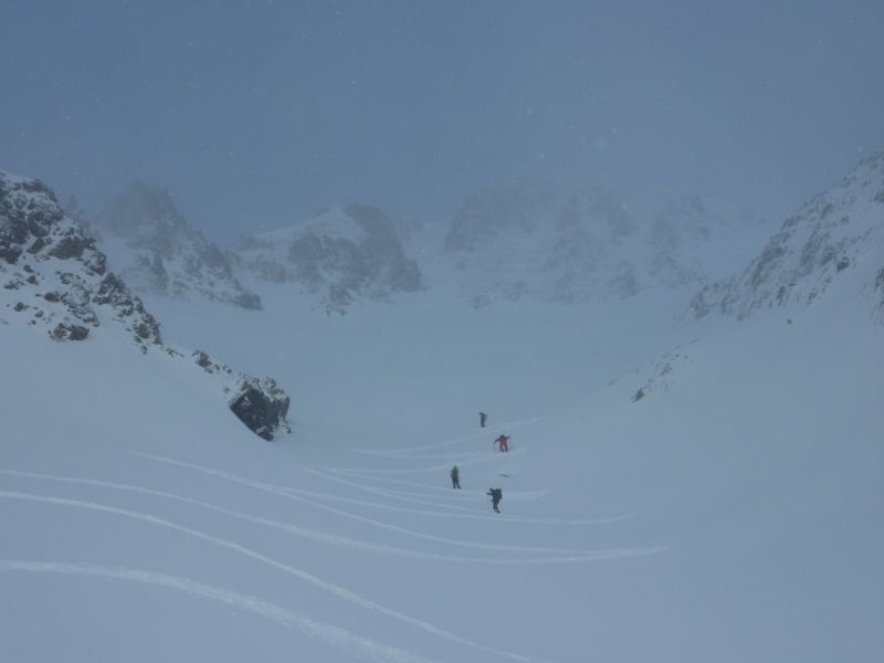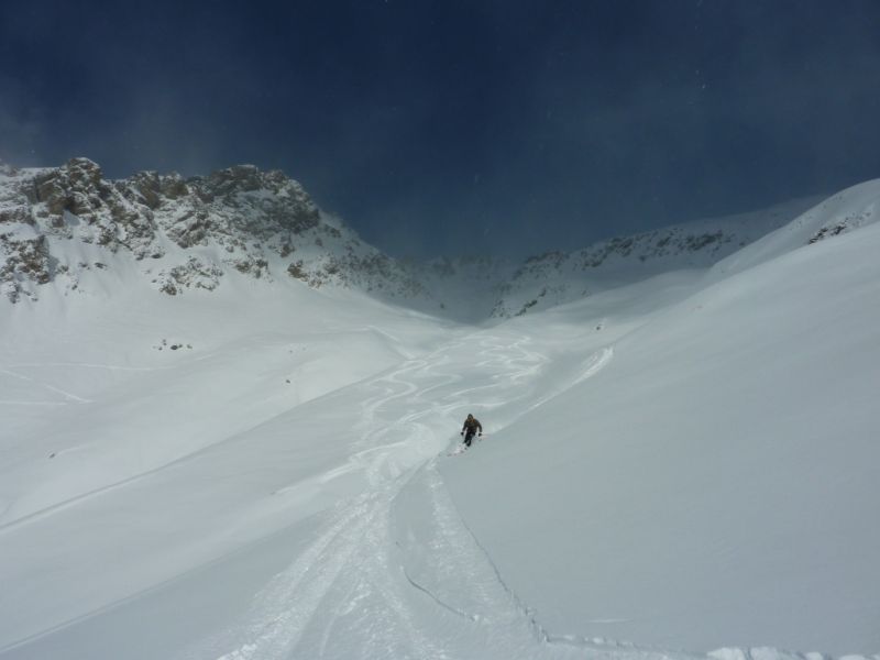 On est resté plus dans le fond du vallon à la montée. Et tout droit pour la sortie par le couloir le plus enneigé (50m).