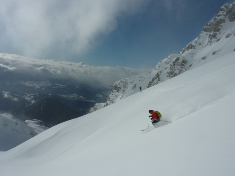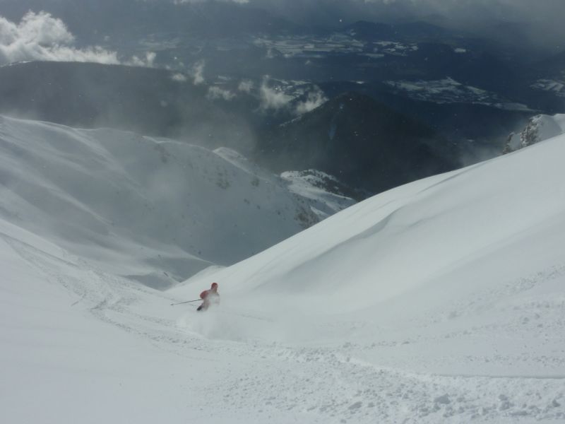 Le vallon qui mène au Coiro s'est bien enneigé cette nuit et ce matin. A partir de 1700m on compte environ 20cm de neige fraîche. Relativement protégé du vent à la différence de la traversée plus bas, peu d'accumulations constatées hormis le petit couloir de sortie chargé sans doute par le nord. Cyril est parti avec une petite plaque sans conséquence sauf pour le couloir ramené à son état de neige dure. Globalement ce secteur est bien moins enneigé que la Chartreuse. Heureusement les champs du bas de et sous la crête de Cote Belle semble avoir été épargnés par la caillasse.