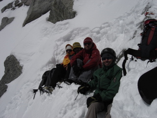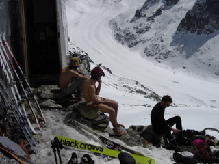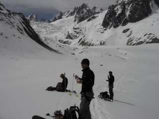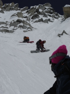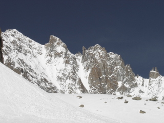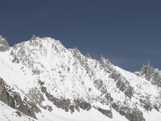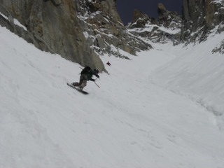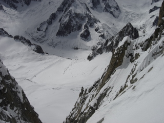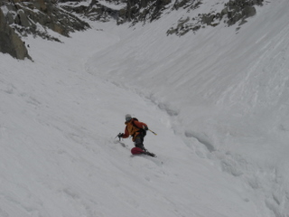 c'est magnifique, à notre goût à tous les 5, bien plus qu' un whymper et surtout moins fréquenté. goulotte de 30 m. au départ après la rimaye. panorama fabuleux et ambiance garantie. on a attendu 3 h. au sommet que ça revienne un peu tellement c'était béton. il faut être à son affaire car avec la goulotte centrale on ne skie que les contrepentes ça ne descend jamais en dessous de 50° et malgré le soleil le fond est bien dur. en prime rappel au dessus de la goulotte, toutes les composantes d' une belle sortie. une fois au pied du couloir, c'est 1300 m. de neige printemps à mach 12 jusqu' à leschaux sans voir personne....le bonheur quoi !!!