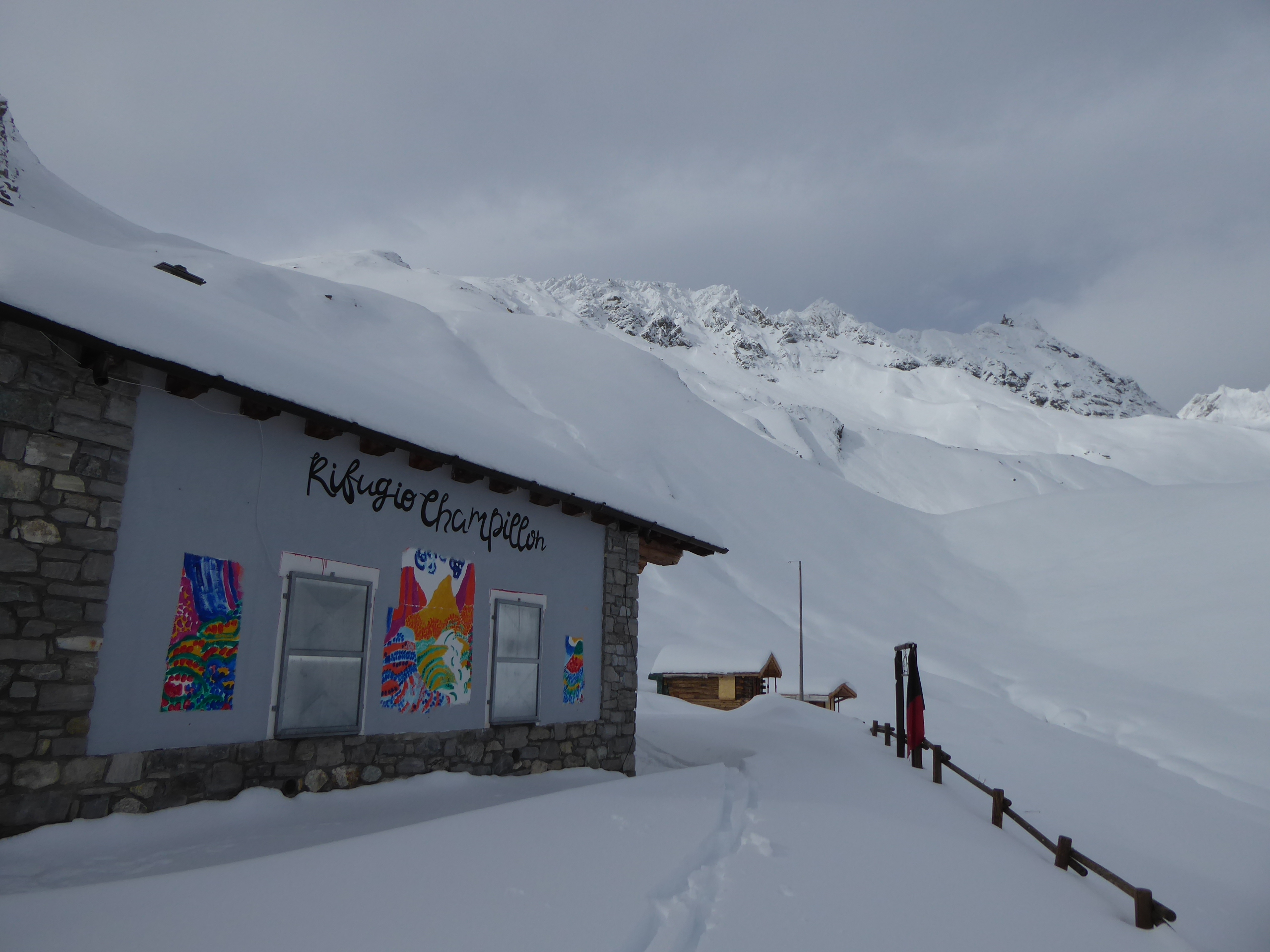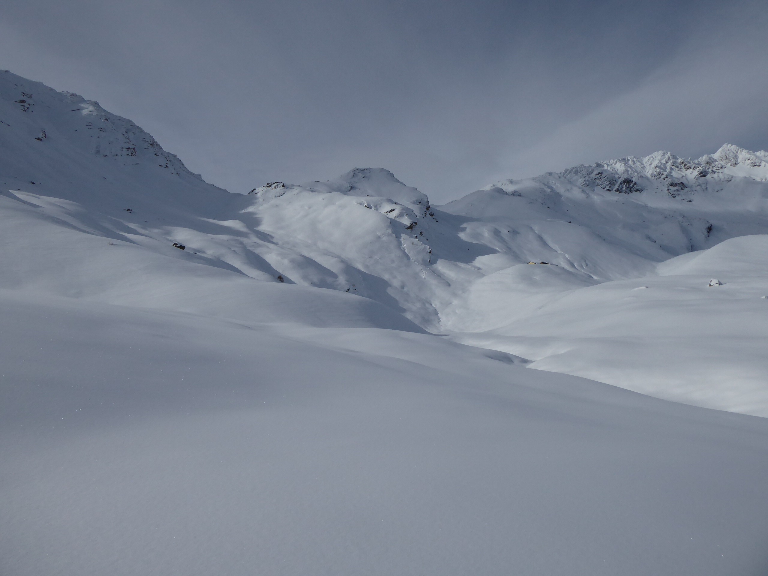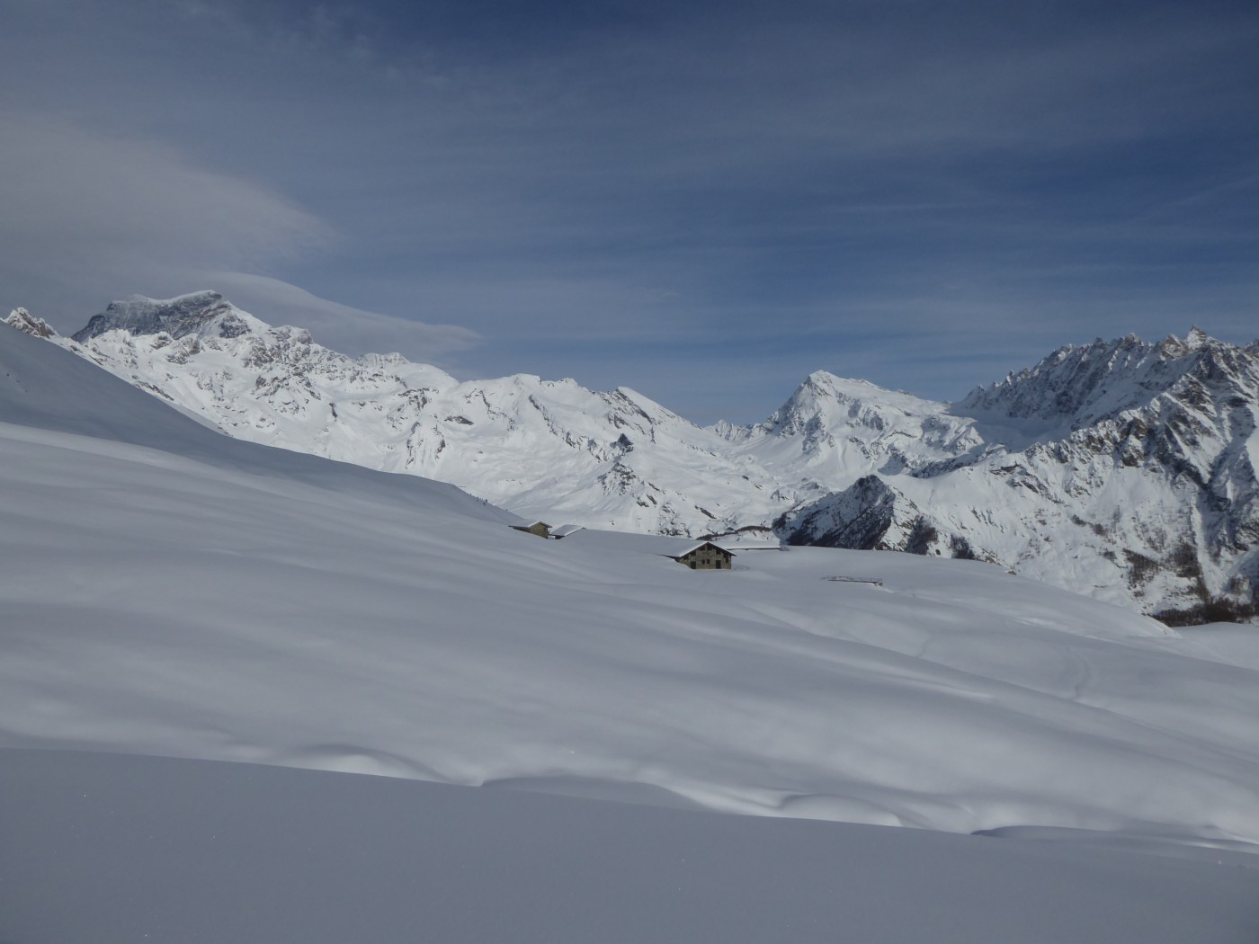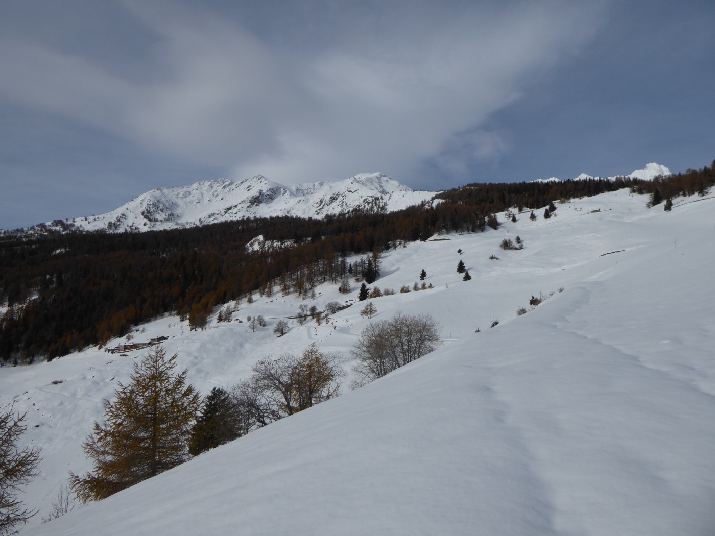 Bon enneigement en vallée d'Aoste grâce aux perturbations de ces derniers jours. La rive droite semble mieux fournie encore. La douceur qui a suivi, a humidifié la neige en surface jusque 2500m. Aujourd'hui c'était crouté en-dessous.