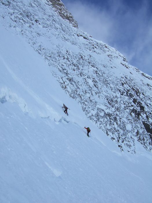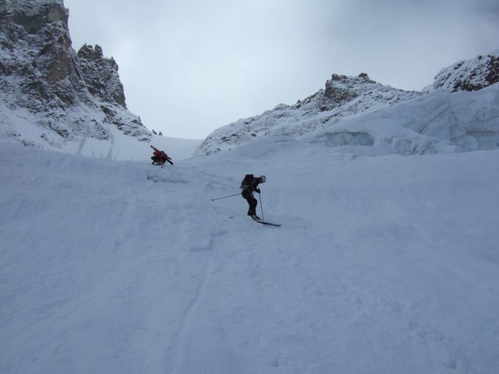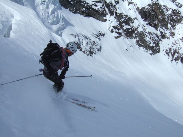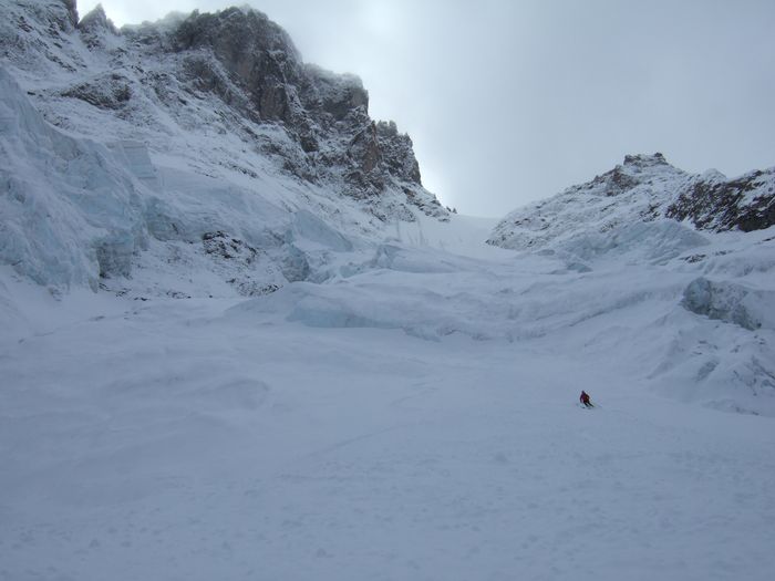 Itinéraire grandiose qui louvoie entre les séracs et les passages en glace. Il fallait toutefois se méfier avec cette neige légère qui laisse parfois place à la glace bleu sous les carres des skis!