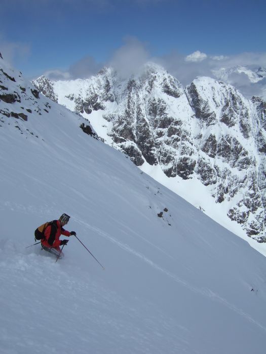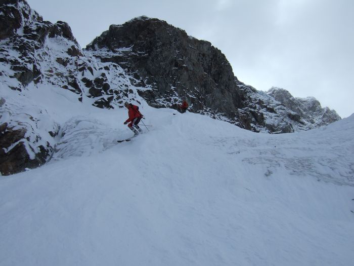 Pente terminale en excellente condition en rive gauche (plus à droite la glace n'est pas loin). Le glacier d'Armande est en poudre légère qui n'adhère par très bien à la glace! Un passage d'une vingtaine de mètres avec les carres sur la glace vive, ensuite 2 courts passages négociables en "tout droit".