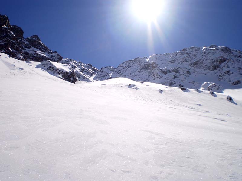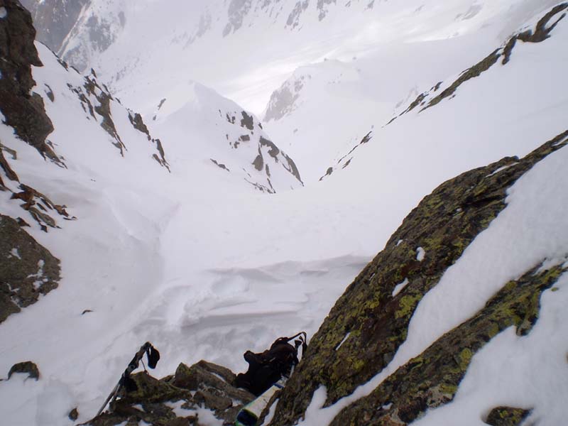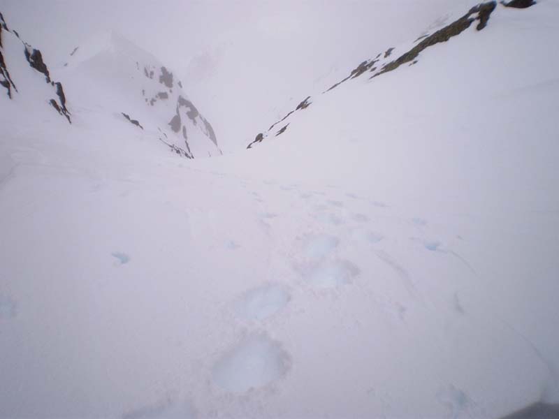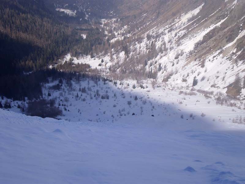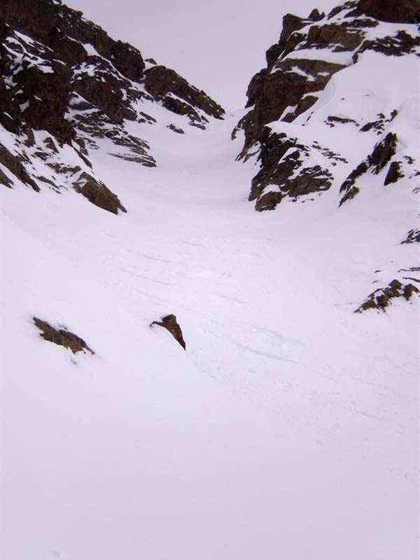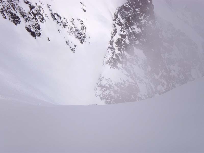 S'il s'agissait de faire du grand ski, ce n'était pas la bonne sortie, d'autant que la meilleure neige, transfo revenue sous 1800, a été gâchée par un effet de jour blanc... Du très bon ski tout de même entre 2750 et 2400, bonne poudreuse un peu évoluée. Le couloir se skie bien, mais on fait deux ou trois virages et on s'arrête pour laisser descendre la neige. Il est étroit dans les dix derniers mètres. J'ai pu remonter en peaux jusqu'à cet endroit et j'ai dû finir à pied. Très bon ski aussi tout en bas, où la végétation sert de repère. Les nuages avaient gardé la neige au poil. Neige collante sur la piste.