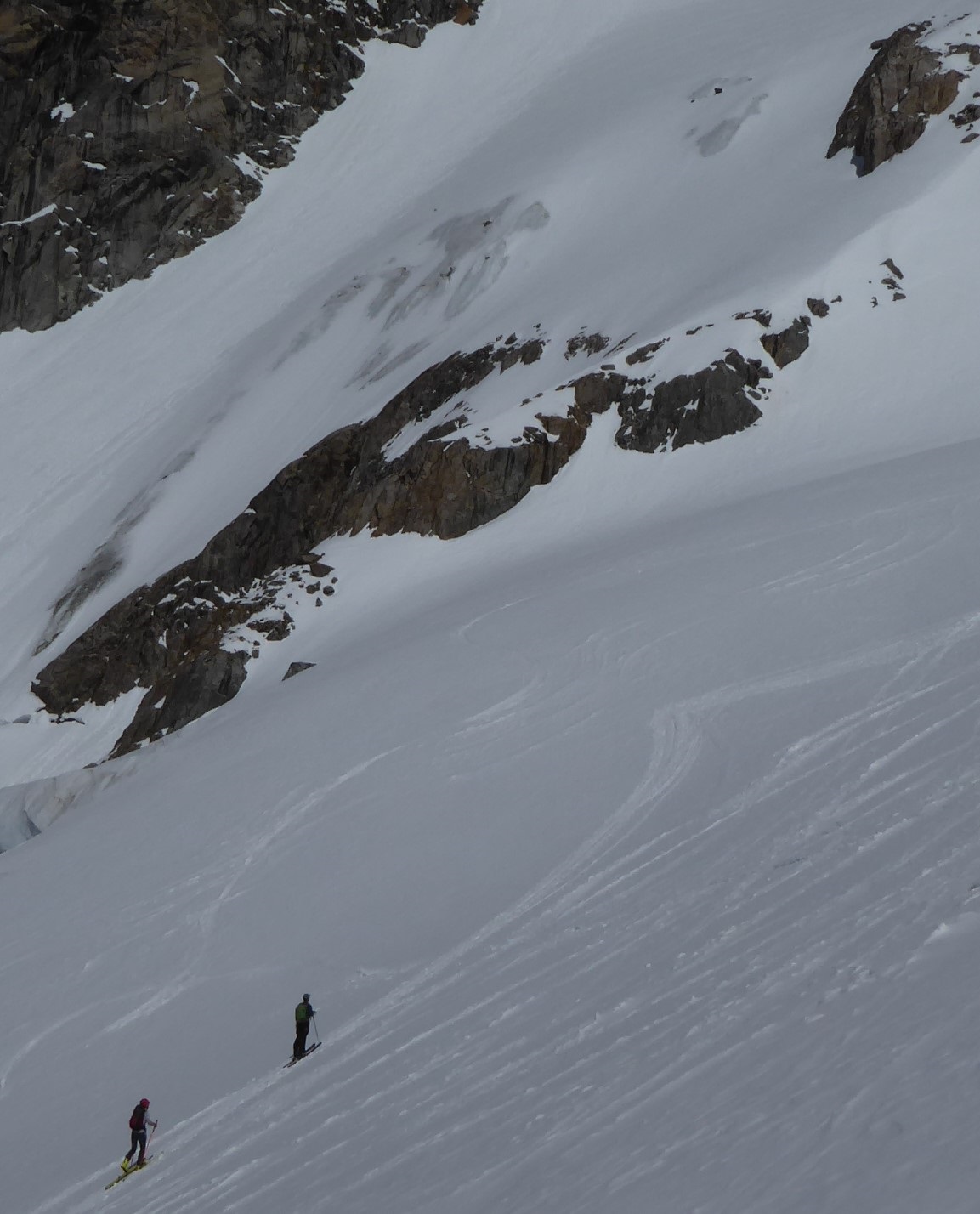 La neige s'humidifie à toutes les altitudes fréquentées plus ou moins en fonction de l'orientation, de l'altitude et de l'horaire. Nombreuses purges dans les pentes raides de la rive gauche du glacier du tour Noir (pointes des Améthystes).