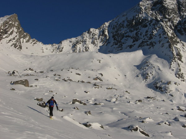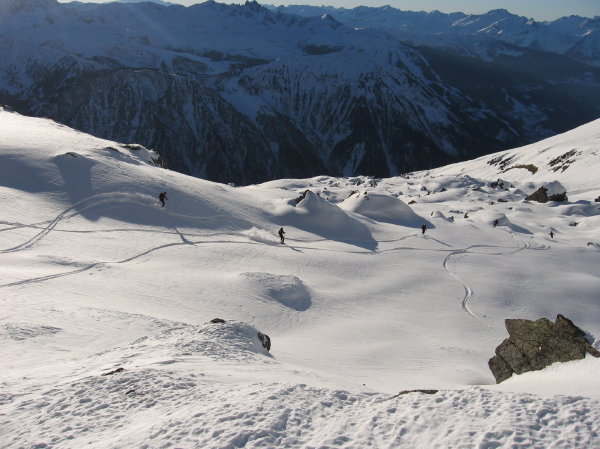 Le vent de la nuit ou de la journée a créé des petites accumulations. Stop 100m sous le col car la consistance de la neige ne nous inspirait pas confiance.