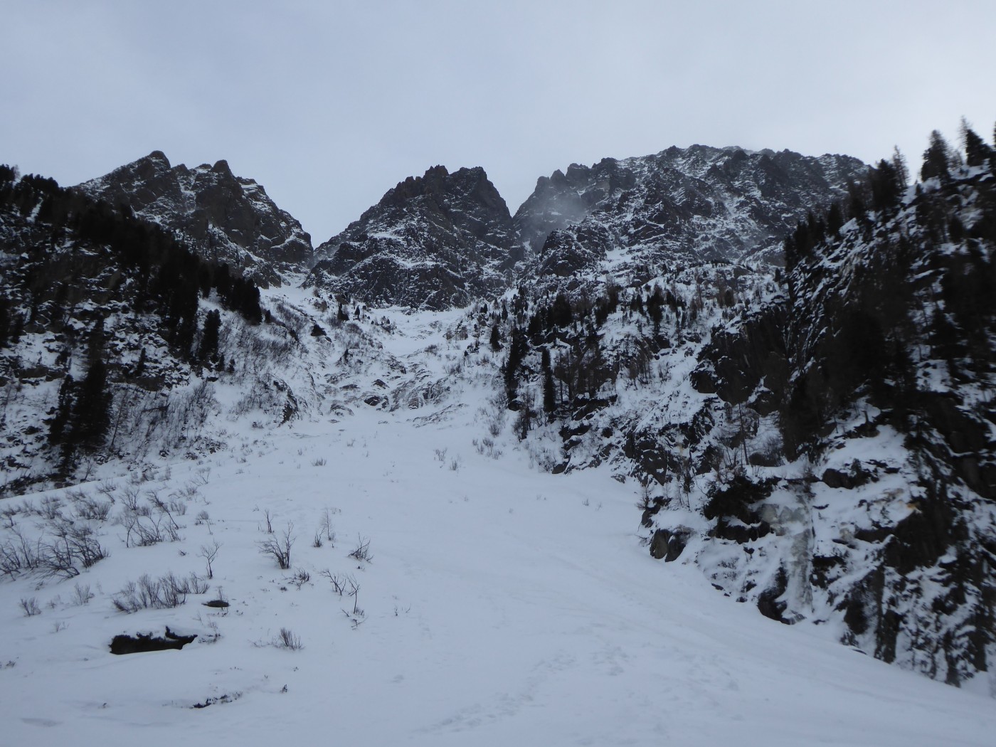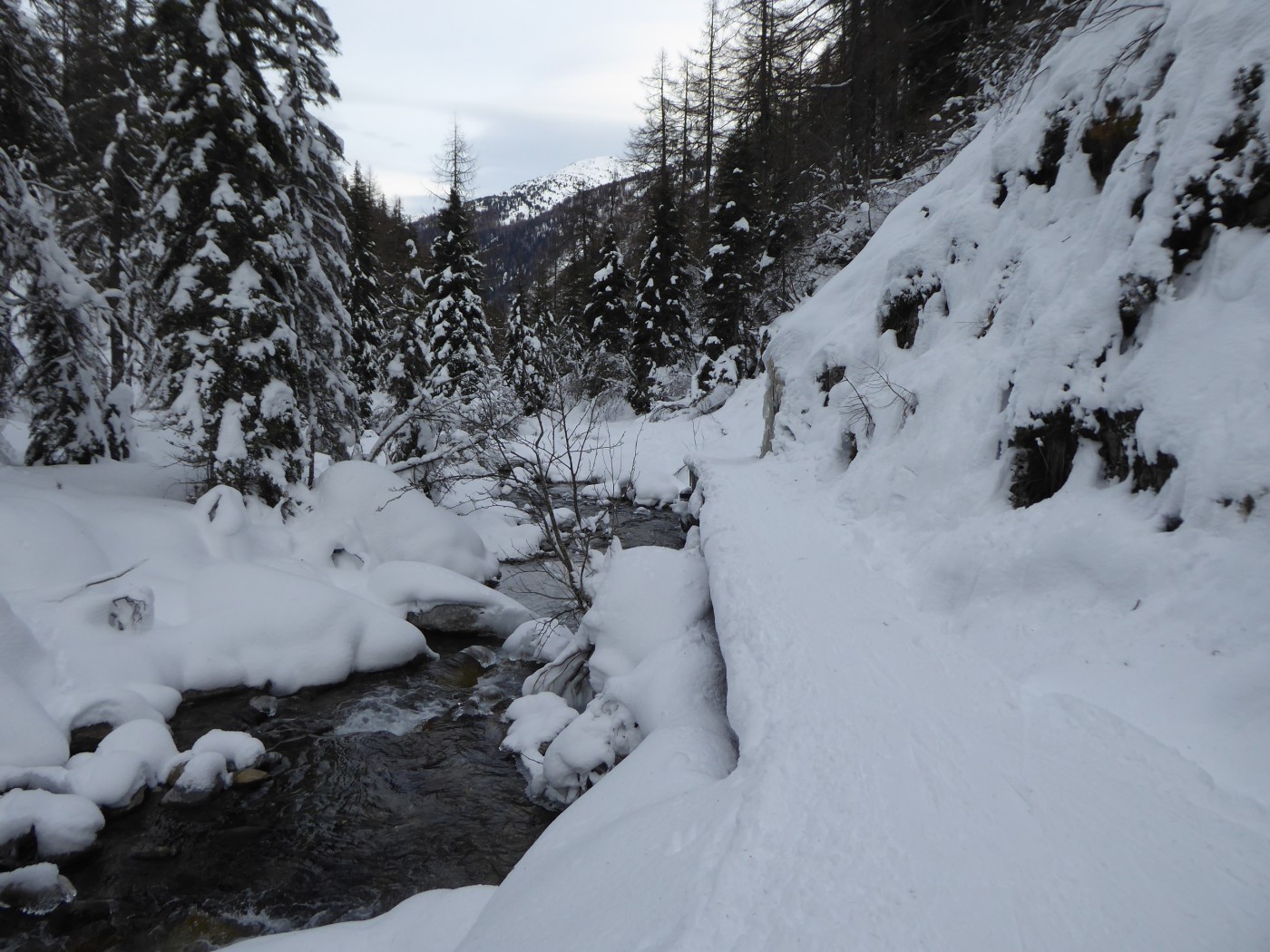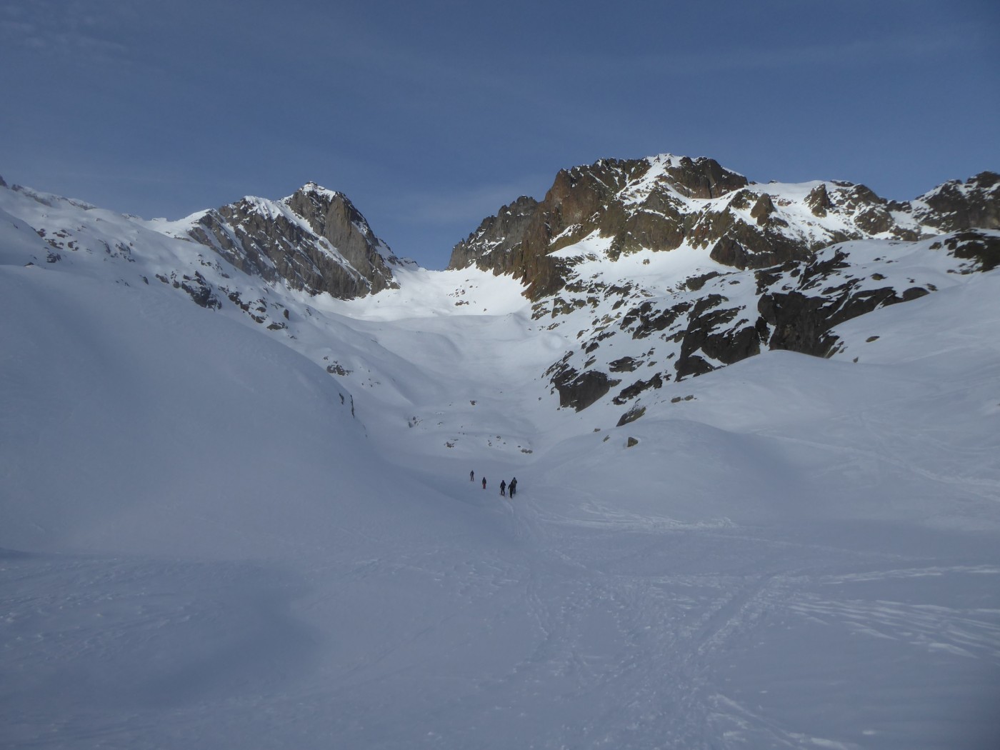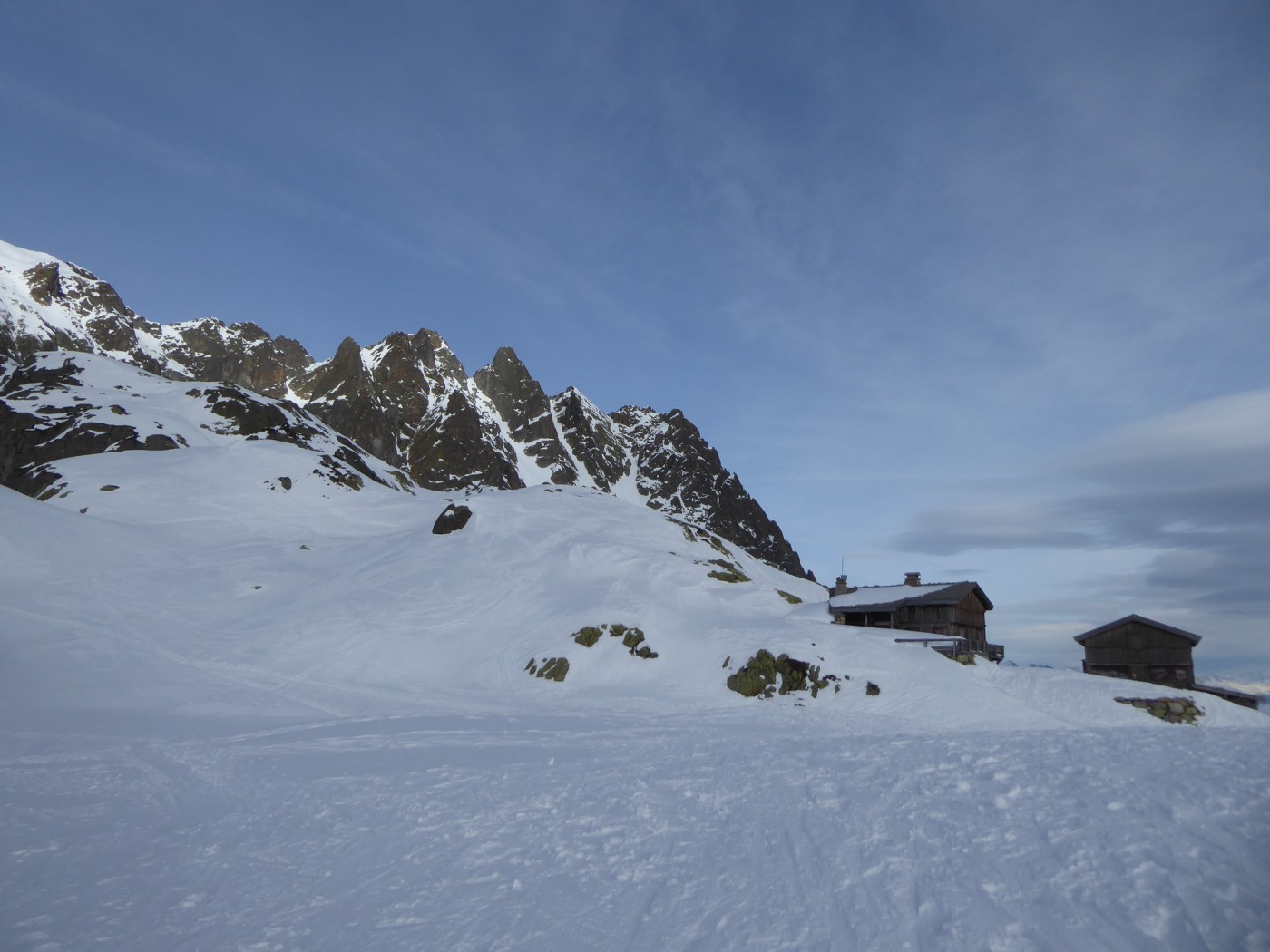 J'ai choisi cette option de départ pour éviter la foule en partant d'un arrêt du MBE. Le sentier passe à skis malgré quelques passages dégarnis. Plusieurs traces indiquent qu'il est plutôt emprunté par les randonneurs à raquettes. Il y a de la neige sur tout le parcours mais pas en grande quantité. La rampe d'accès au col est en bonnes conditions : encore de la neige qui était bien dure aujourd'hui avec le vent. La descente côté nord n'est pas bien garnie en neige. Une main courante est en place à gauche pour franchir les premiers mètres en partie rocheux. En-dessous, la neige est dure, raclée par les passages. Le bas du vallon de Bérard passe à skis (rive droite) mais il faut souvent déraper sur des vernes et faire attention aux cailloux. Les bras de ruisseau se franchissent sans déchaussage. Arrivée à skis à l'hôtel du Buet.