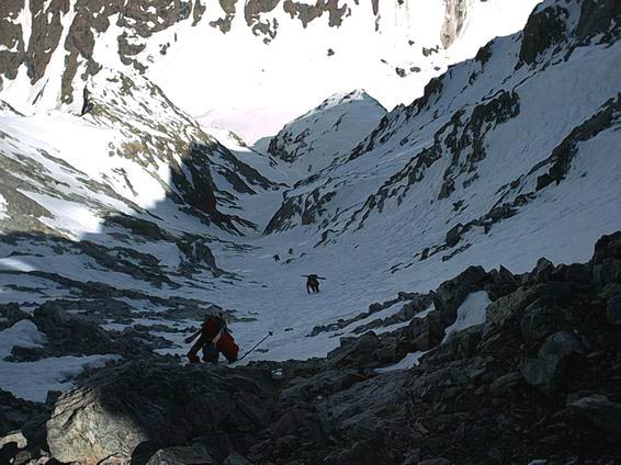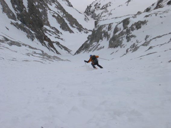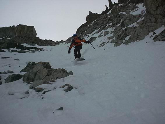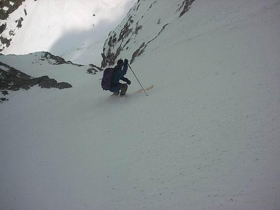 Ce ne fut pas du tres grand ski, mais plutot du ski physique en particulier dans la section 2800/3000 rendue tres penible par les reliefs et les petites pierres qui jonchent cette partie. Pour le reste, quelques portions correctes mais jamais pendant tres longtemps. JBT, qui eu le plaisir de descendre le couloir en poudre integrale il y a quelques annees, s'est d'ailleurs abstenu de skier la partie haute et on peut le comprendre Le couloir est globalement peu rempli. La sortie est rocheuse, nous avons chausse 10m sous le col