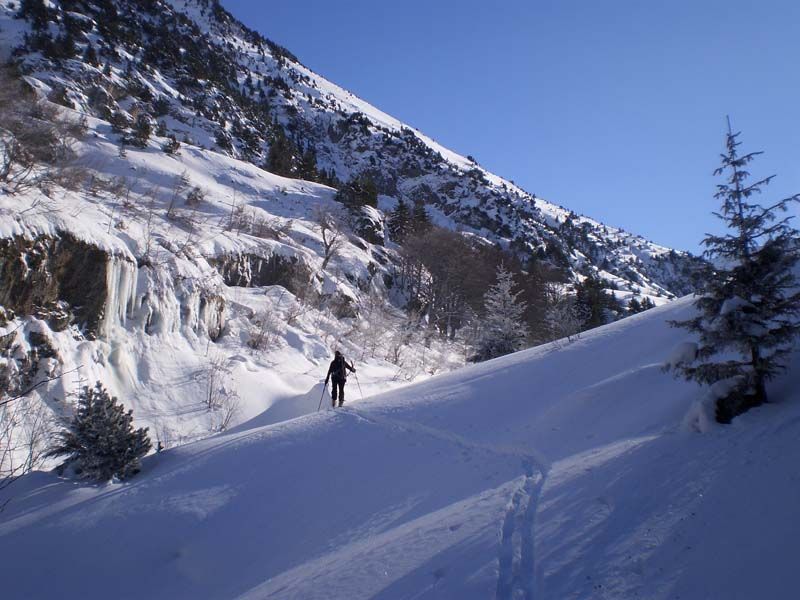 Très jolie petite course, qui est déjà assez exigeante du fait du long plat du départ et de la neige pas toujours très facile à tracer aujourd'hui. Nous avons vu les traces des skieurs partis faire Émay-Ramays. J'ai rarement vu le secteur en si bonne forme et nous avons pu limiter les déchaussages à trois en montant et deux à la descente. Tout se skie, et presque sans touchette. La poudreuse voisinait parfois avec de petites zones soufflées, il faut bien choisir...