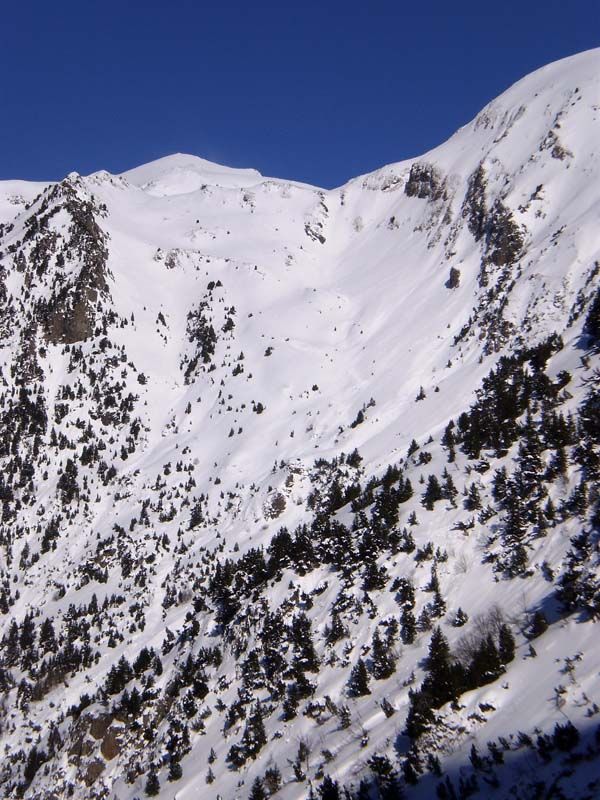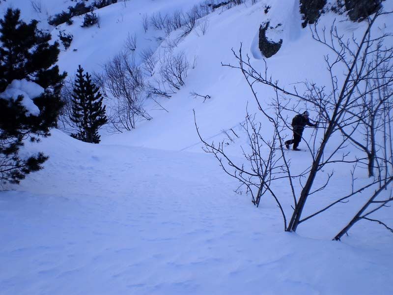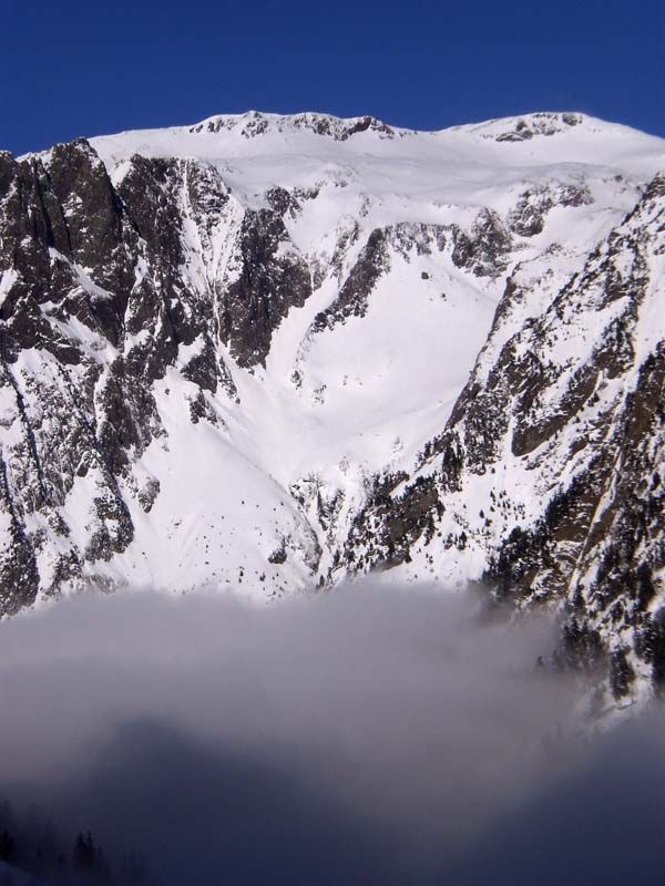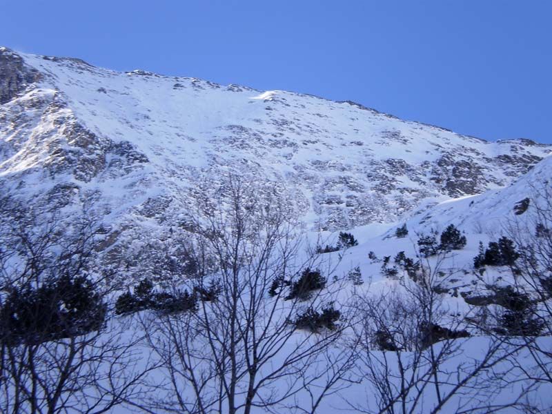 J'ai regardé un peu le manteau dans le couloir est vers 2200, pente 30 à 35° : 20 cm de poudreuse légère sur 20 cm de plaque friable (grains fins liés) qui descend sans aucun effort en glissant sur les couches plus profondes. Méfiance dans les pentes fortes... Quelques plaques sont descendues jusqu'au torrent de Vaunoire sur le versant NE. Mais rien pour l'instant dans la combe du Grand Armet qui a l'air en bonnes conditions.