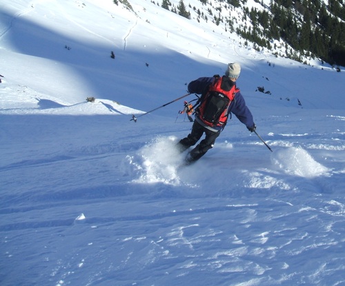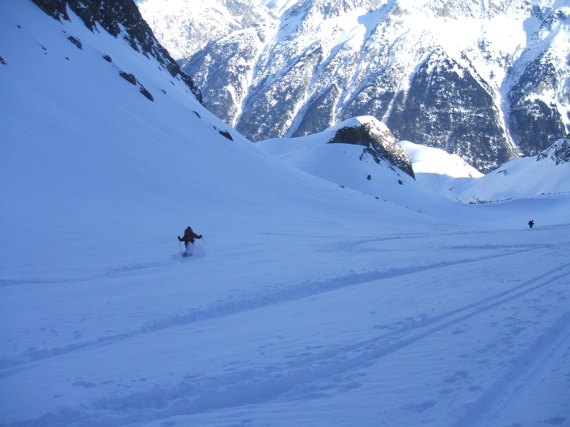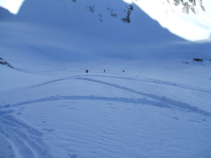 Les 1000 premiers mètres sont en poudre, plus ou moins dense, le vent à dû travailler. Plus on monte, plus le doute se faisait sentir, une neige type gros grains cohabite avec une neige plus croûtée, voire plaquée par endroit. Des zones entières sont en gros sel, sans cohésion, c'est notamment le cas de la dernière pente sous le col.