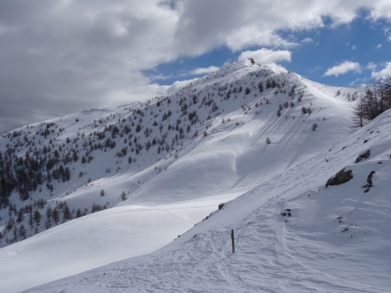 ras, sauf la trace de montée qui passe soigneusement dans la seule zone raide (>30°) sous le col, facilement contournable par la droite.