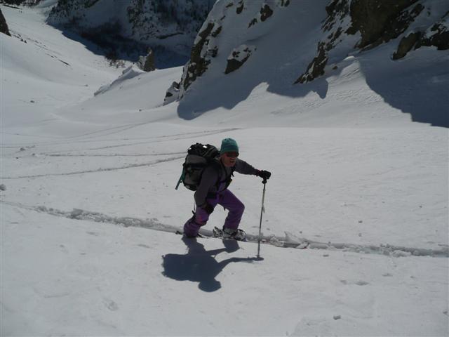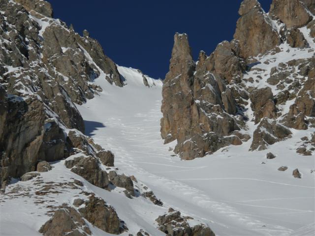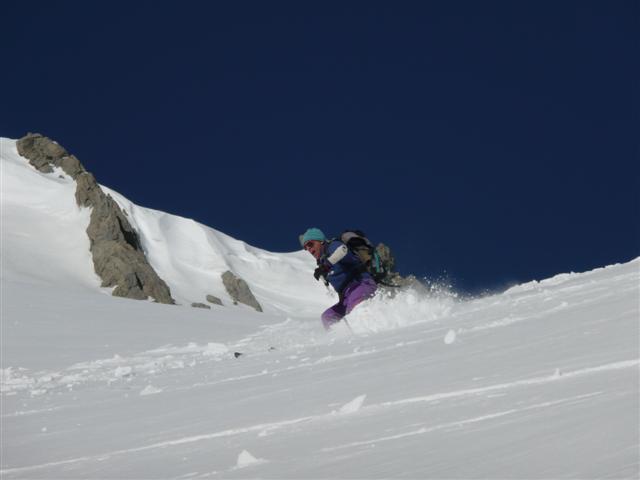 A la descente,chercher les grosses veines de poudre en rive droite de ce petit couloir en S(3.2 E.1).Pour cette fois ,le vallon de Combe Bonne est agréable à skier tellement il est enneigé.