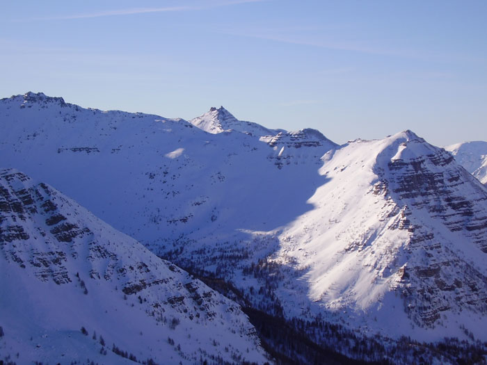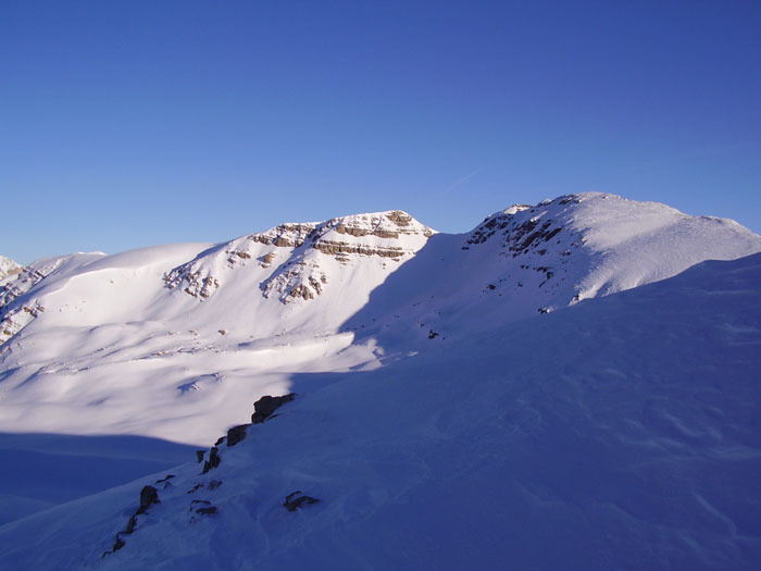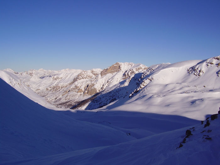Pas un seul voum à la montée, bon signe. Des plaques assez importantes sont déjà parties (et cela était impératif) sous la tête du Laup (SO) et ont atteint l'itinéraire normal. D'autres sont parties sous la cime de la Plate, traversant l'itinéraire. Je n'étais pas mécontent de passer dans le secteur à cette heure matinale... La zone exposée va de 2000 à 2200 environ et c'est long à parcourir quand on trace dans 50 de poudre avec plusieurs traversées de ravins assez creux. La montée finale au col était légèrement plaquée sur la fin, mais ce n'est pas raide. Plus sérieusement plaqué sur l'autre versant en rive droite à éviter (orientations SE sujettes aux plaques ces jours-ci). Ensuite, les couches sont assez stables, mais il faudra se méfier du redoux qui pourrait bien atteindre des couches profondes très piégeuses (gobelets vers le sol et une cou