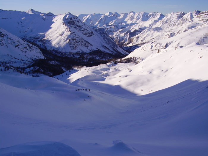 Inscrit pour un stage de cartographie samedi et dimanche, et nanti de l'information selon laquelle la route de Bayasse était ouverte depuis jeudi après-midi, j'ai préféré m'y rendre de cette façon. Mais le stage débutant à 9 h, le départ très matinal s'imposait. Je pensais arriver au col vers 8h30 et prendre une demi-heure pour descendre. Las ! Parvenu au col à 9h15, il m'a fallu plus d'une heure pour descendre, tellement la neige était dégueu (et il y a beaucoup de plat en bas), sauf dans les 200 premiers mètres. Mais Jean-Claude, qui assurait le stage, m'a quand même très bien accueilli... C'est Gilles, qui tient très sympathiquement le refuge de la Cantonnière, qui m'a expliqué de quelle façon le manteau neigeux s'était constitué dans la région. Il va falloir patienter pour attaquer les grosses pentes et les spots d'Estenc...