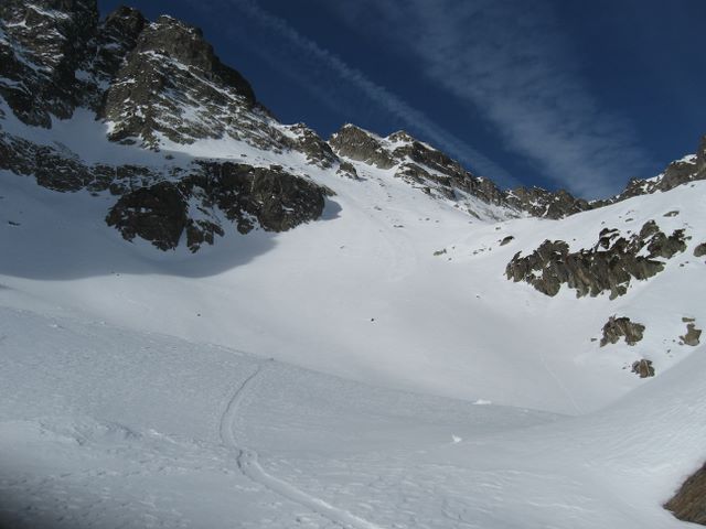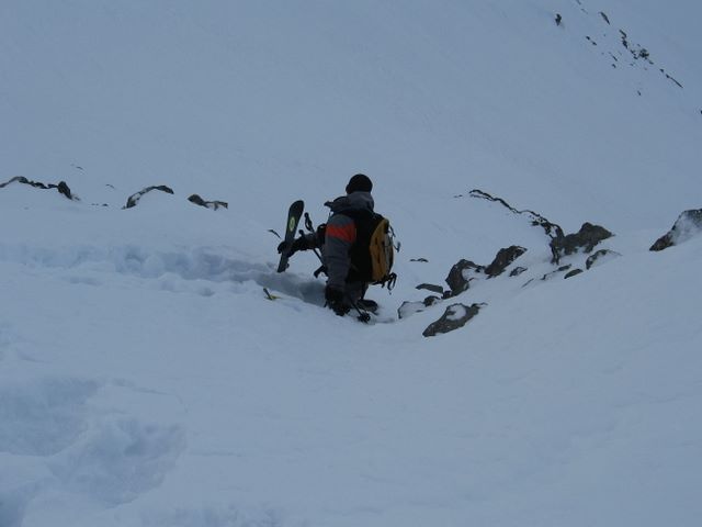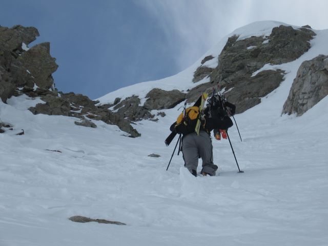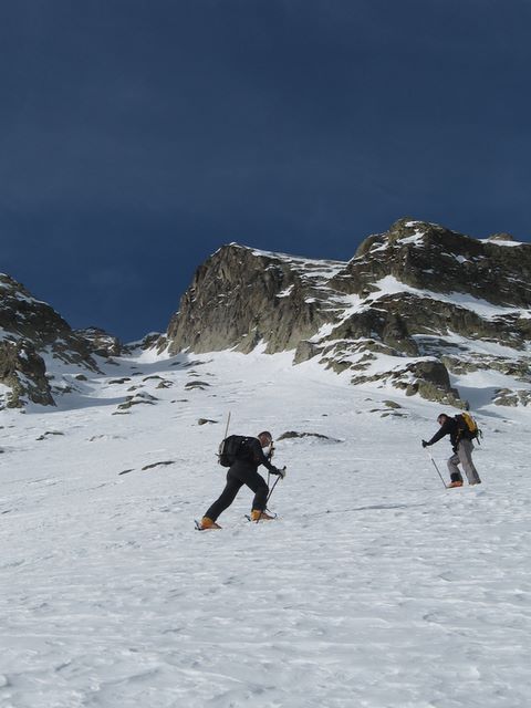 Une belle course, mais des conditions de ski, délicates. On a finit la remontée du Col à pied, la neige se dérobe systématiqment ... impossible d'avoir des appuis stables.