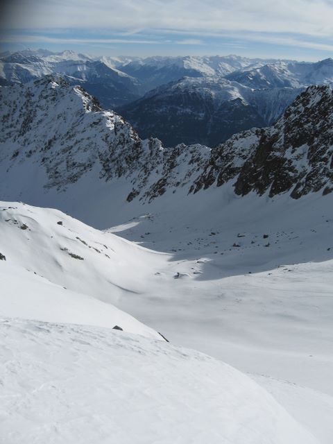 On voulait faire la bascule coté ouest depuis le Col et faire une boucle par le Col de la Pierre. On l'a tenté, mais après avoir descendu et cherché le bon passage à ski, puis à pied, on s'est résolu à remonter par nos traces... Un bout de ficelle nous à manquer pour assurer le coup du passage clé. Un grosse bataille (brassages) pour remonter à la Valette... Cuisses solides requises avec ces conditions !!