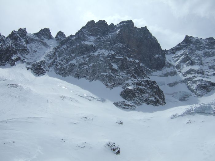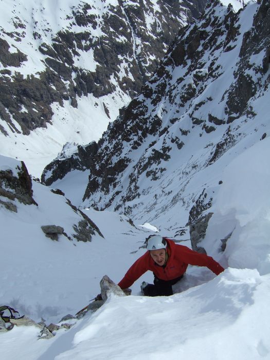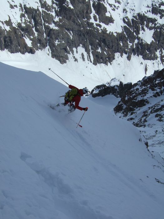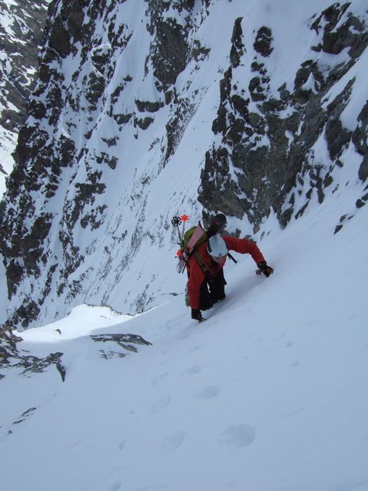 La neige fut excellente dans le couloir N. Poudre tassée typique de couloir raide avec un enfoncement des carres d'environ 5cm. Une petite zone où la glace n'est pas loin.