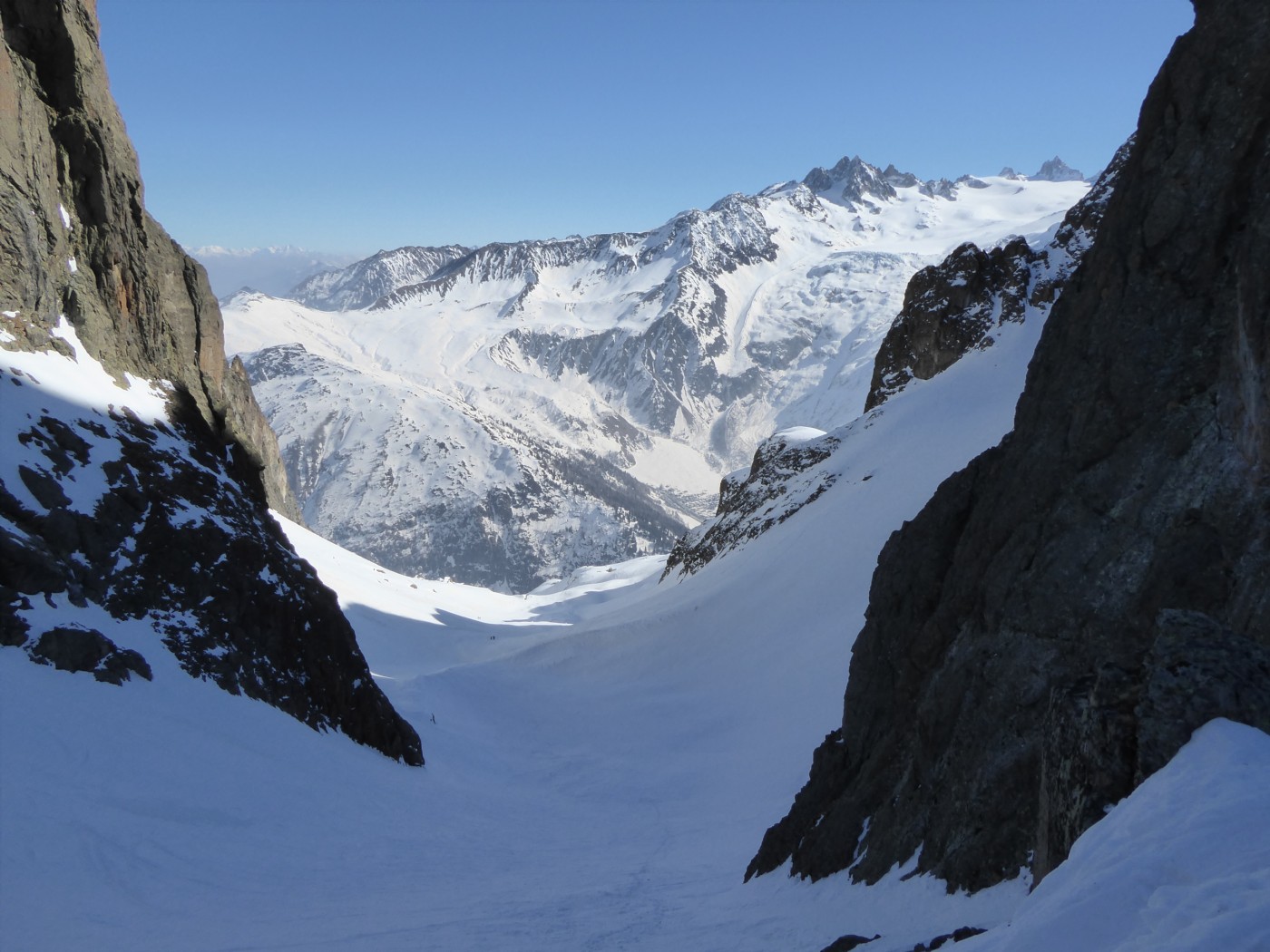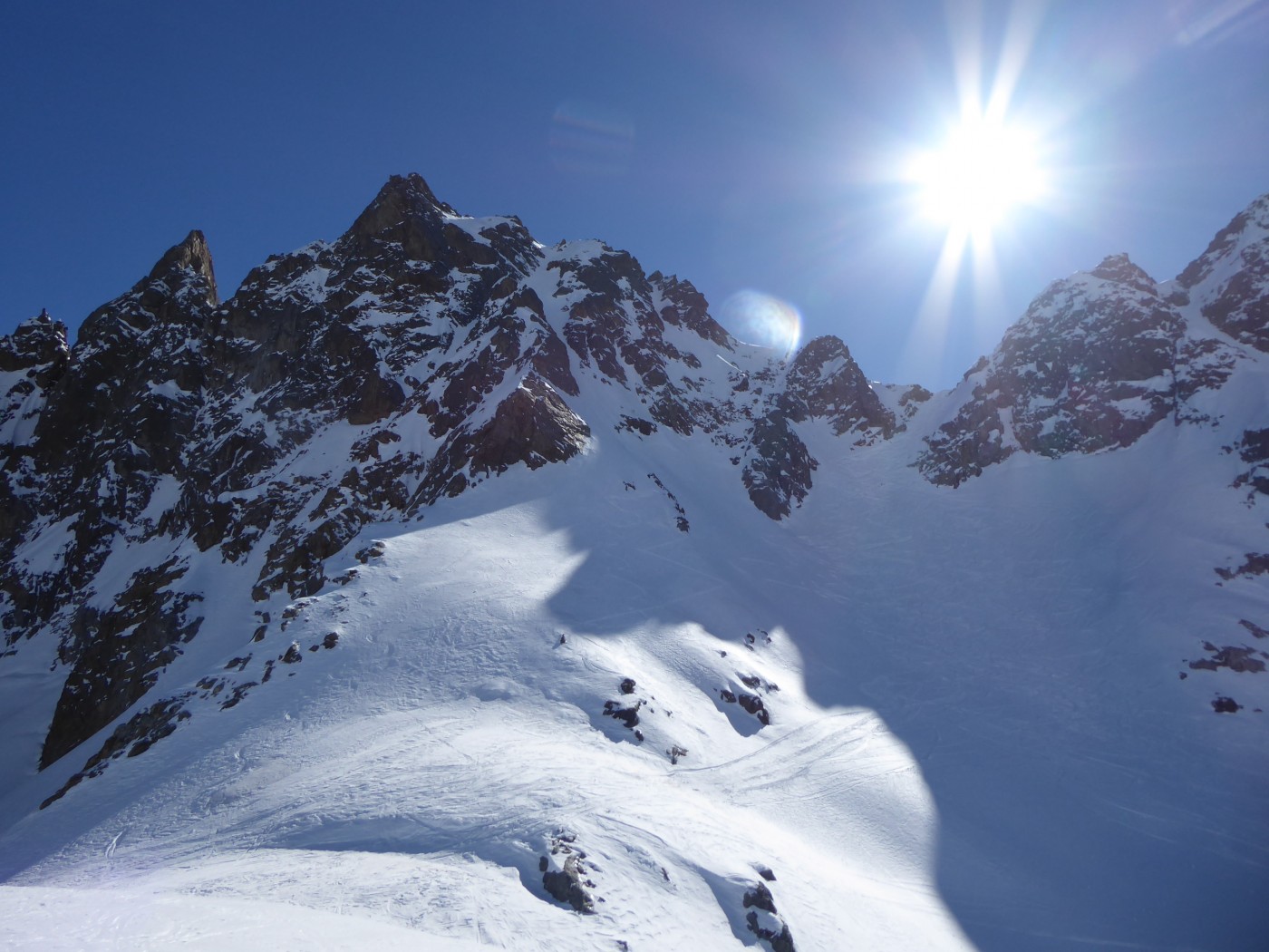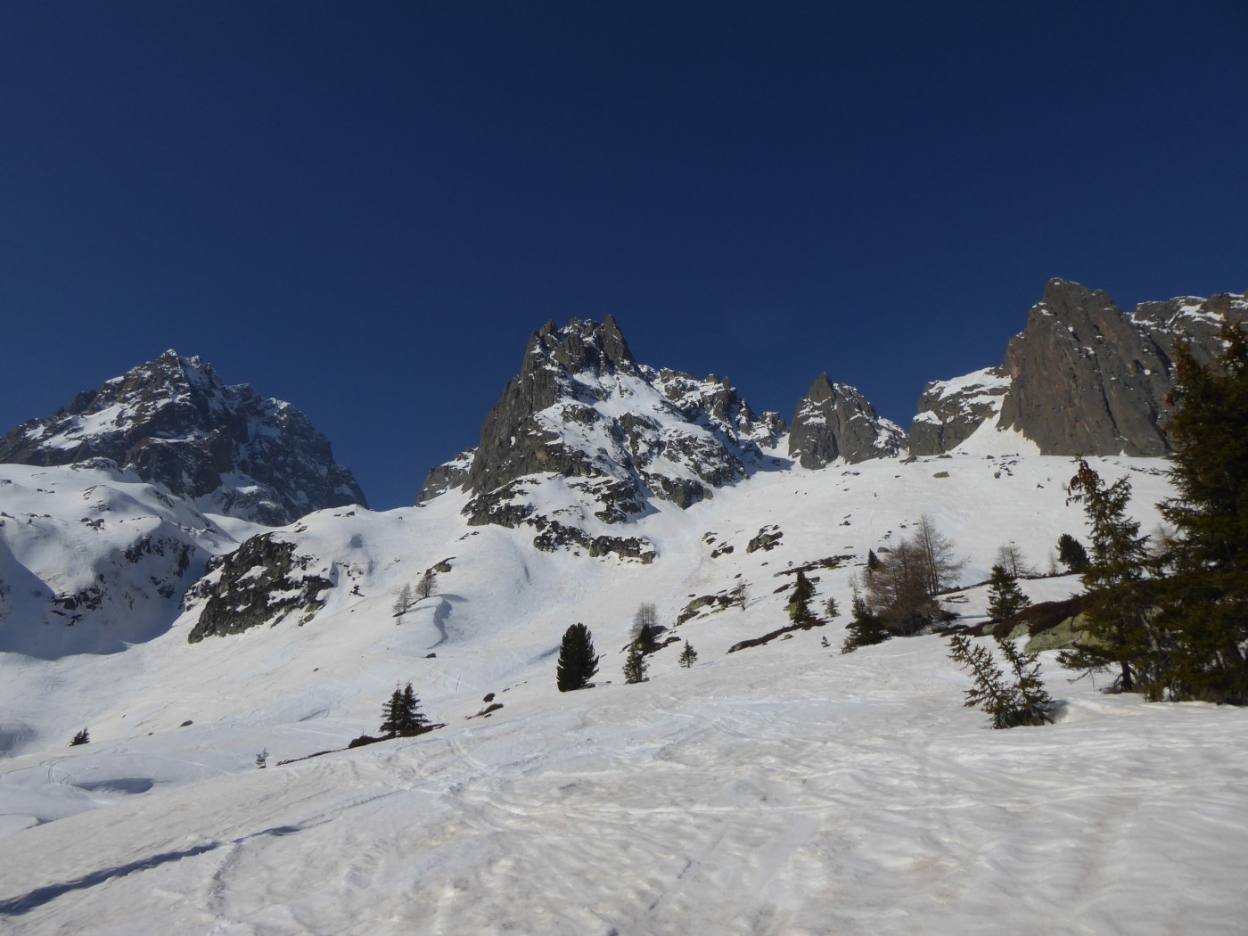Neige transformée côté col des Montets (Est). Vielle neige soufflée mais plutôt agréable à skier côté vallon de Bérard (Nord).