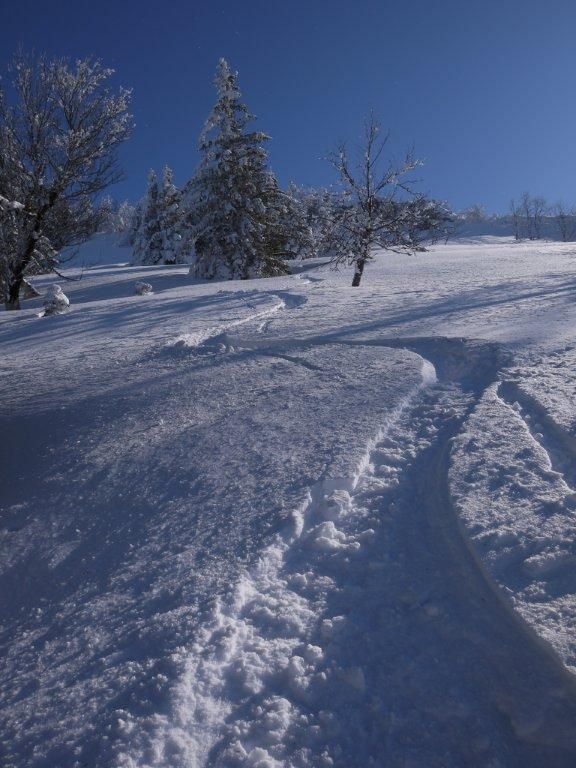 Encore une excellente poudreuse en forêt et en orientation Nord (col de l'Aliénard) sinon poudre dense en forêt (si on sort de la "piste" de montée),et neige cartonnée par le vent en terrain découvert.