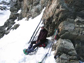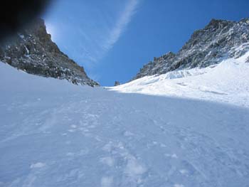 Regel nocturne pas énorme mais suffisant,dans le couloir Nord de la neige ferme au départ, des purges ont eu lieu,vers 3000 m on retrouve des traces des épisodes neigeux précédents en phase avec l'isotherme zéro (vieille poudre compacte), plus haut la neige colle à la glace (l'idée de prendre des vrais crampons au lieu des légers prévus pour le ski traverse l'esprit ),on touche la glace par endroit, la bande pour skier se réduit à 3 à 4 mètres par endroit, place à la glace .