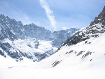 Remonter Valfourche, le glacier de la Plate des Agneaux, , à la Côte 2391m remonter la pente nord de Roche Faurio,nous sommes montés droit dans l'axe du pignon caractéristique situé vers 3000m. Volo (E21) avait du avoir des conditions différentes pour aller à gauche puis à droite).Ensuite tout droit rive droite, pas de probléme de rimaye (elle est bouchée) et le sérac (dont parle Volo) s' est sérieusement assagi avec le temps pour laisser place aux skieurs...La neige collée à la glace sur le haut tient,si le beau persiste une nouvelle chute de neige sera peut être nécessaire pour apprécier intégralement cette belle descente...